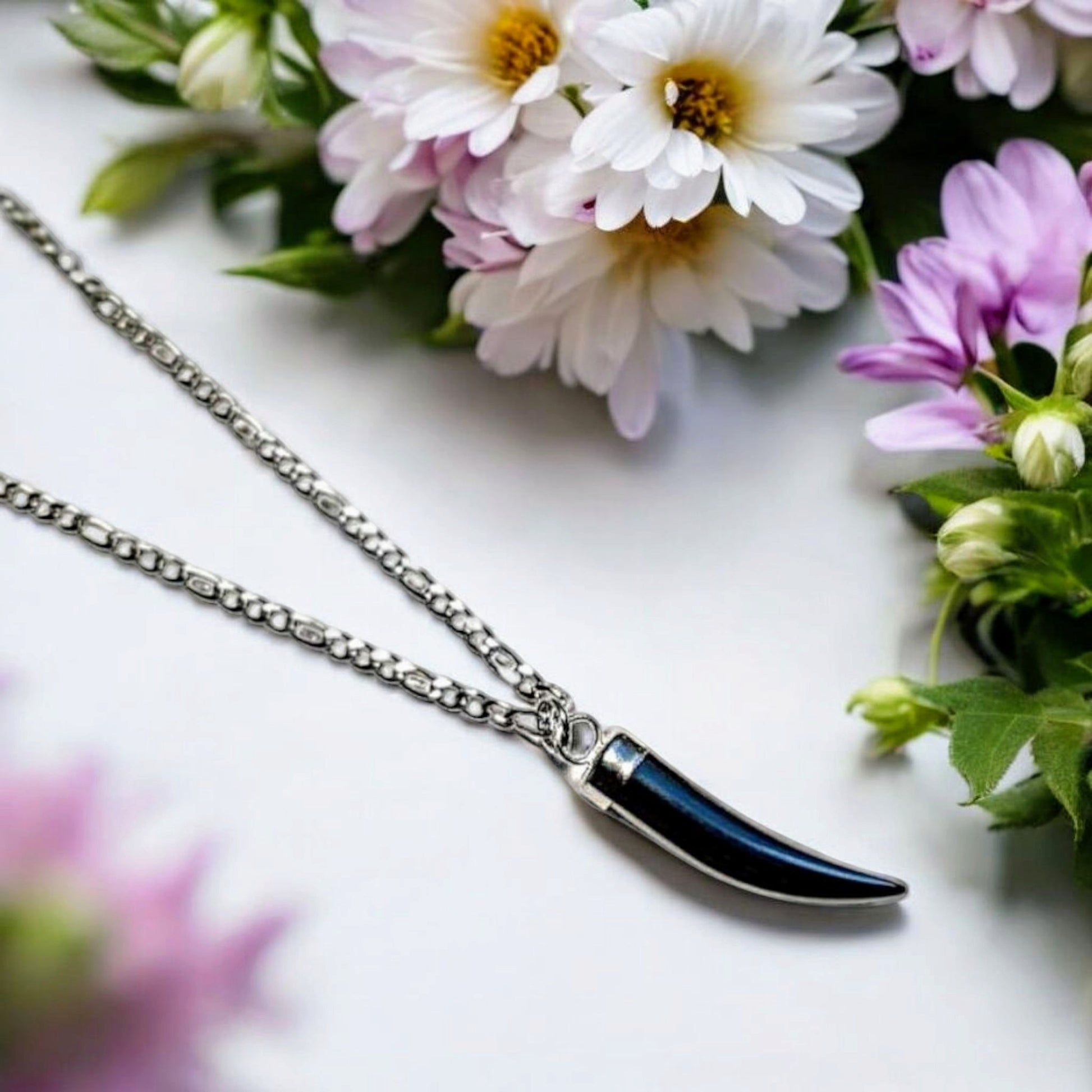 Here is the “ Abéline ” chain , made of hypoallergenic silver stainless steel . It is decorated with a magnificent tooth-shaped bail, 1.5 inches, in natural black hematite stone . This all-purpose piece of jewelry is a great classic, very sophisticated.