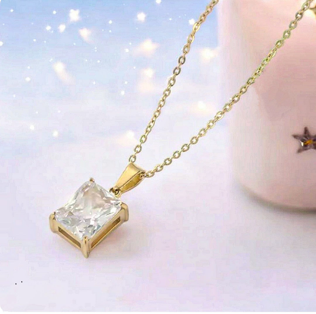 Voici le collier "Angel", 18 po, ajustable avec une rallonge, en acier inoxydable hypoallergénique doré. Il est décoré, d'un magnifique pendentif, zircon rectangulaire 8 x 10 mm, en acier inoxydable hypoallergénique. Ce collier élégant et délicat, s'harmonise avec pratiquement tout.
