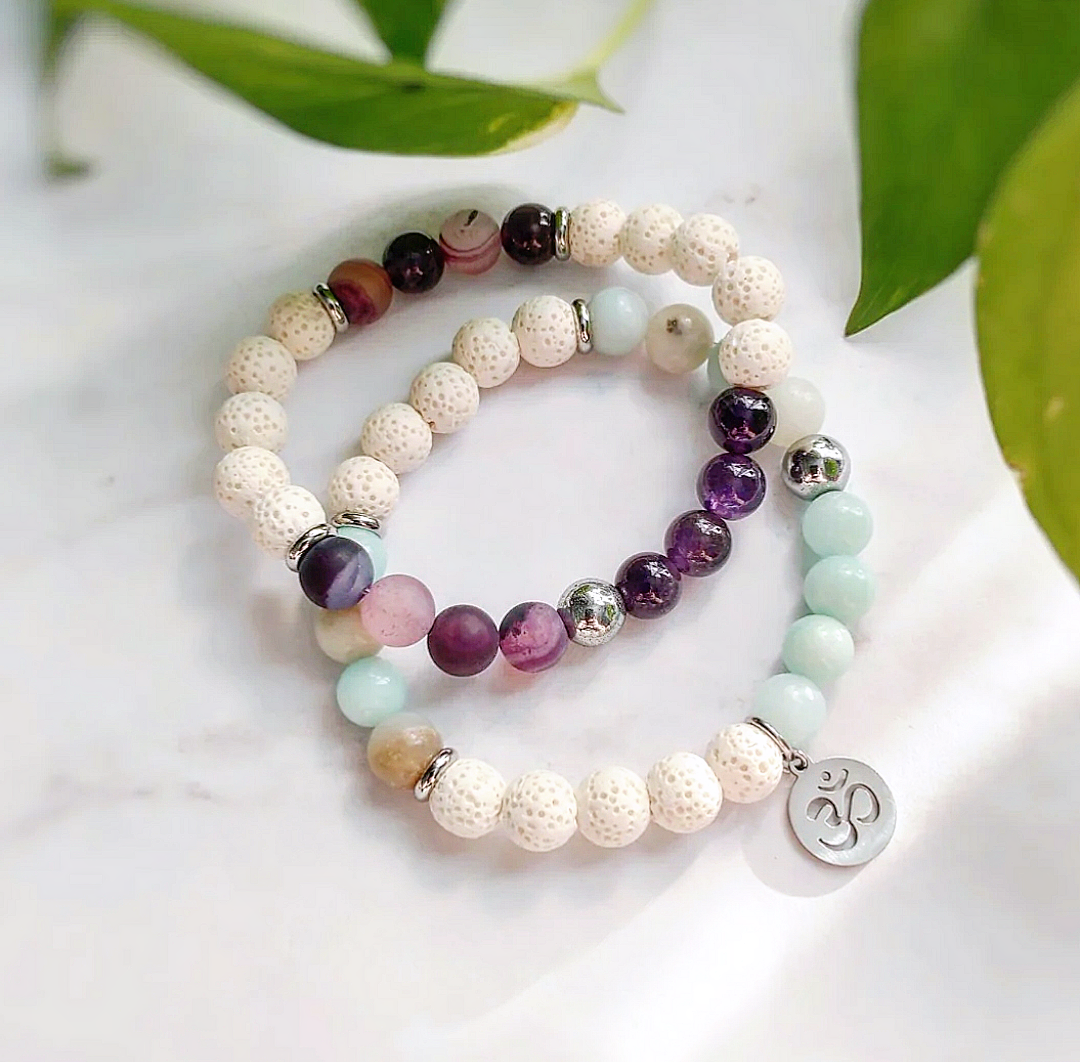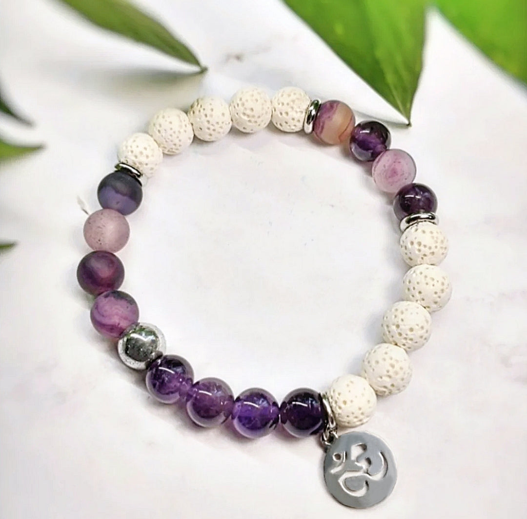 Here is the "Relaxante" elastic bracelet, composed of matte striped agate stone , amethyst, hematite & 8 mm lava stone . It is decorated with a pretty “AUM” charm and of silver stainless steel washers.