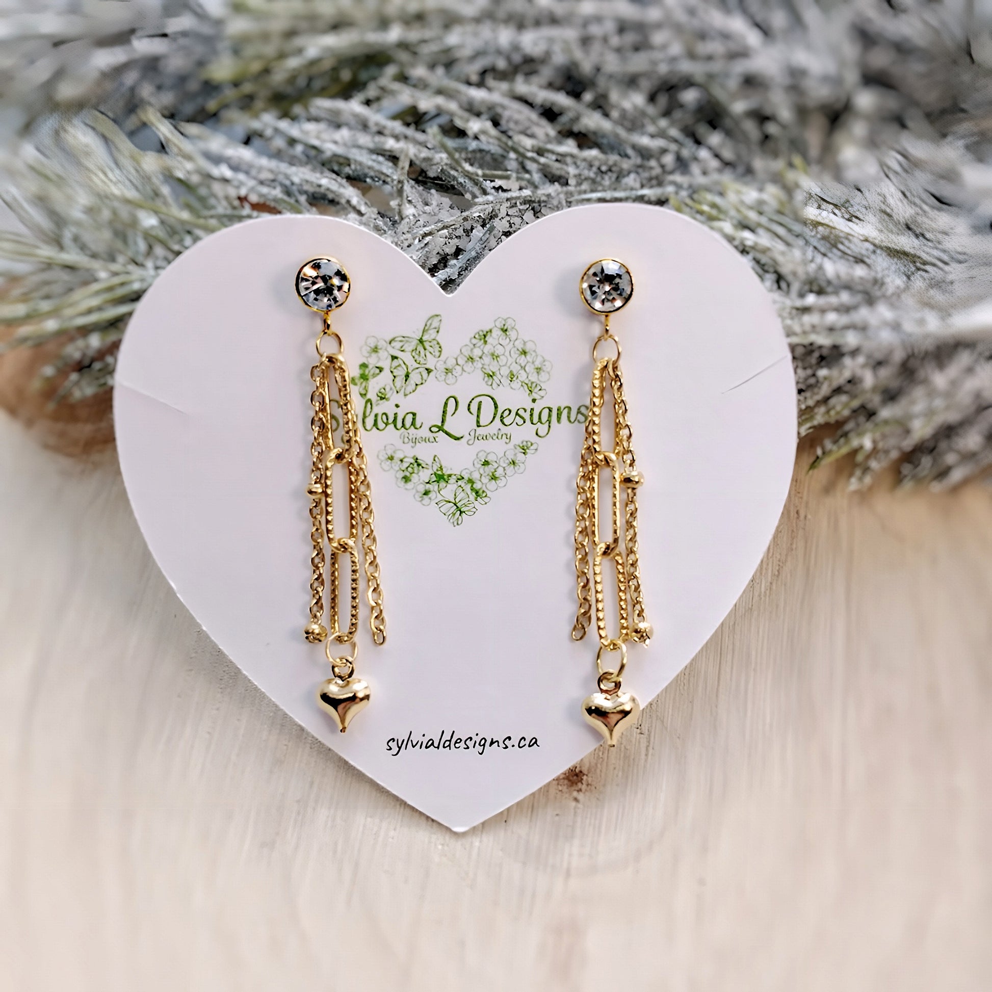 Here are the "Belle" earrings, made of gold stainless steel hooks, adorned with a diamond-colored rhinestone, chains & stainless steel heart-shaped charm Golden. These magnificent beauties go with practically everything.