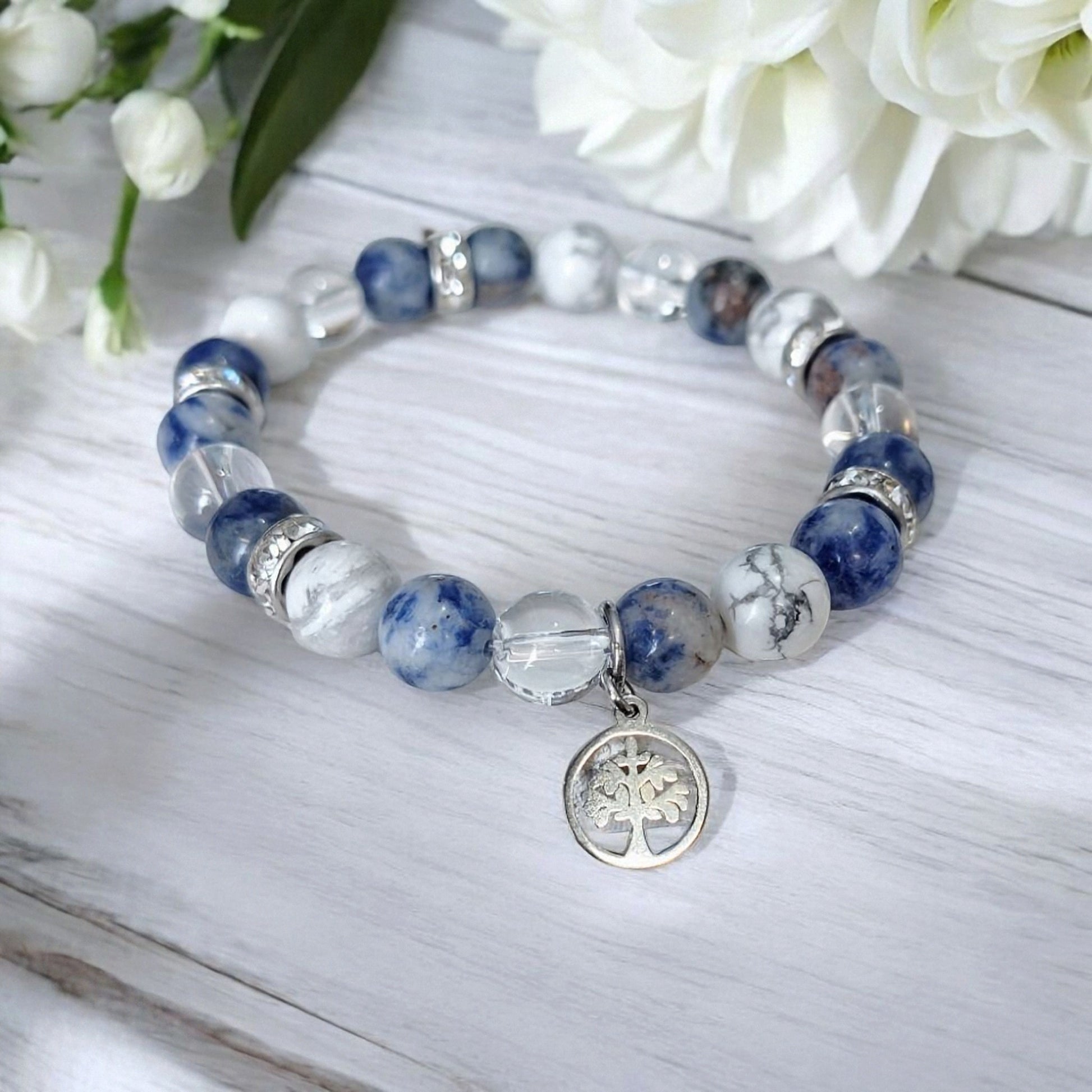 Here is the fairy "Blue sky" bracelet, composed of semi-precious stones of sodalite and white howlite 8 mm.It is decorated with transparent quartz crystal beads, transparent crystal glass beads with rainbow reflections and silver crystal pearls.