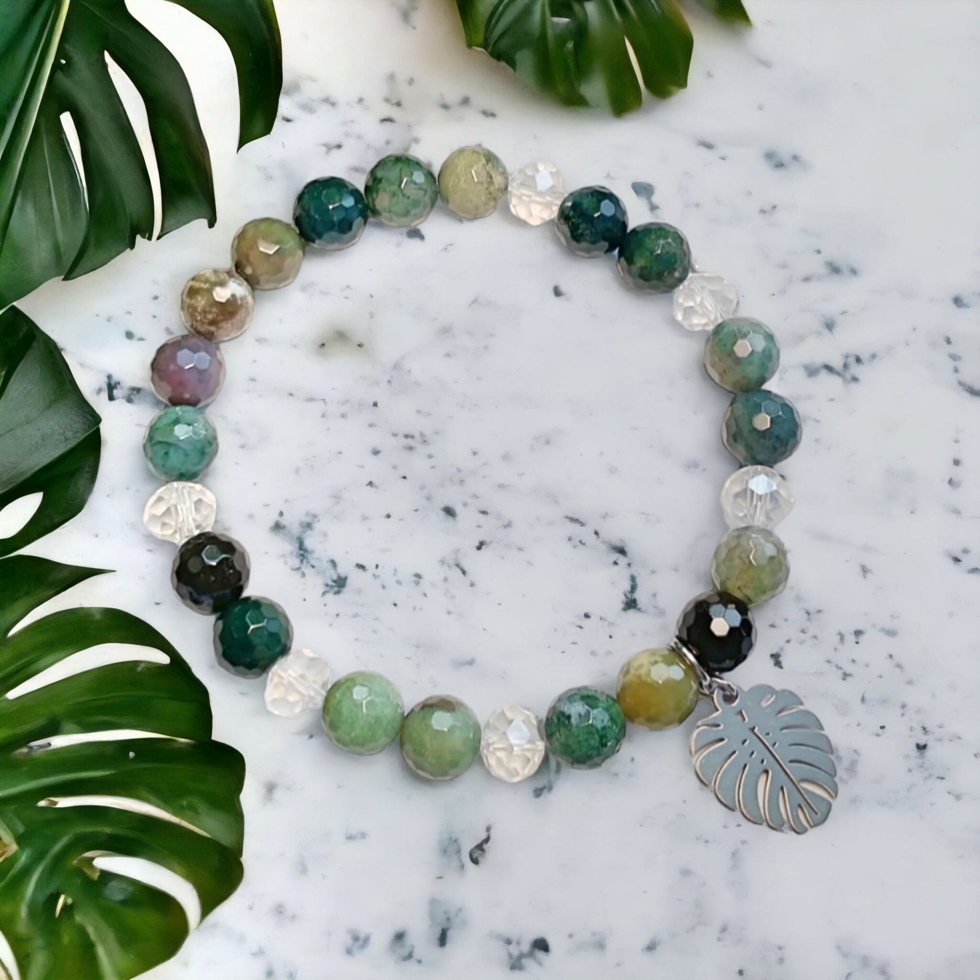 Here is the magnificent "Monstera" elastic bracelet, composed of rock of green moss agate with lustrous facets 8 mm. It is decorated with crystal beads and a monstera leaf charm, in silver stainless steel . Its shine gives a beautiful WOW effect! It goes just as well with a chic outfit as with simple jeans.