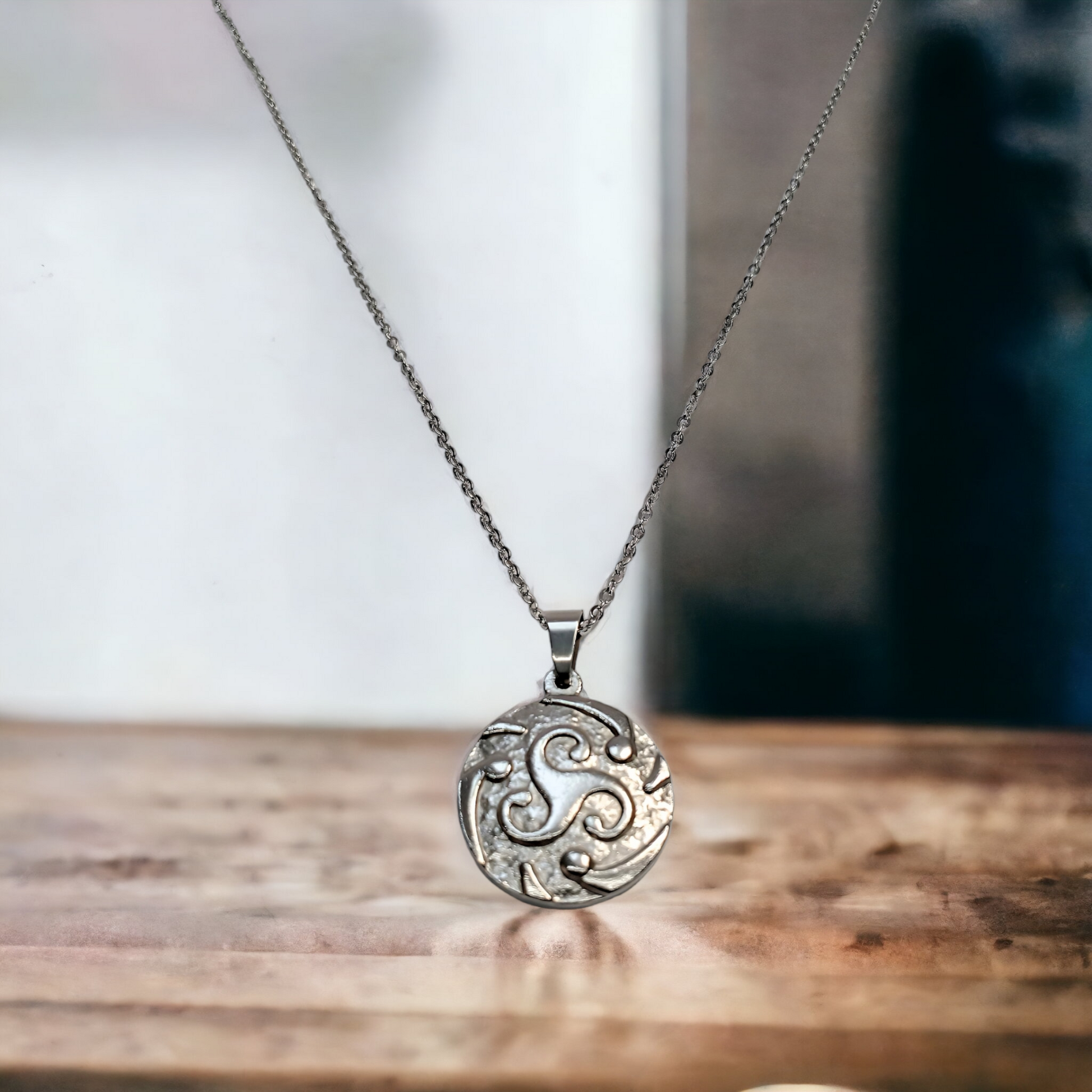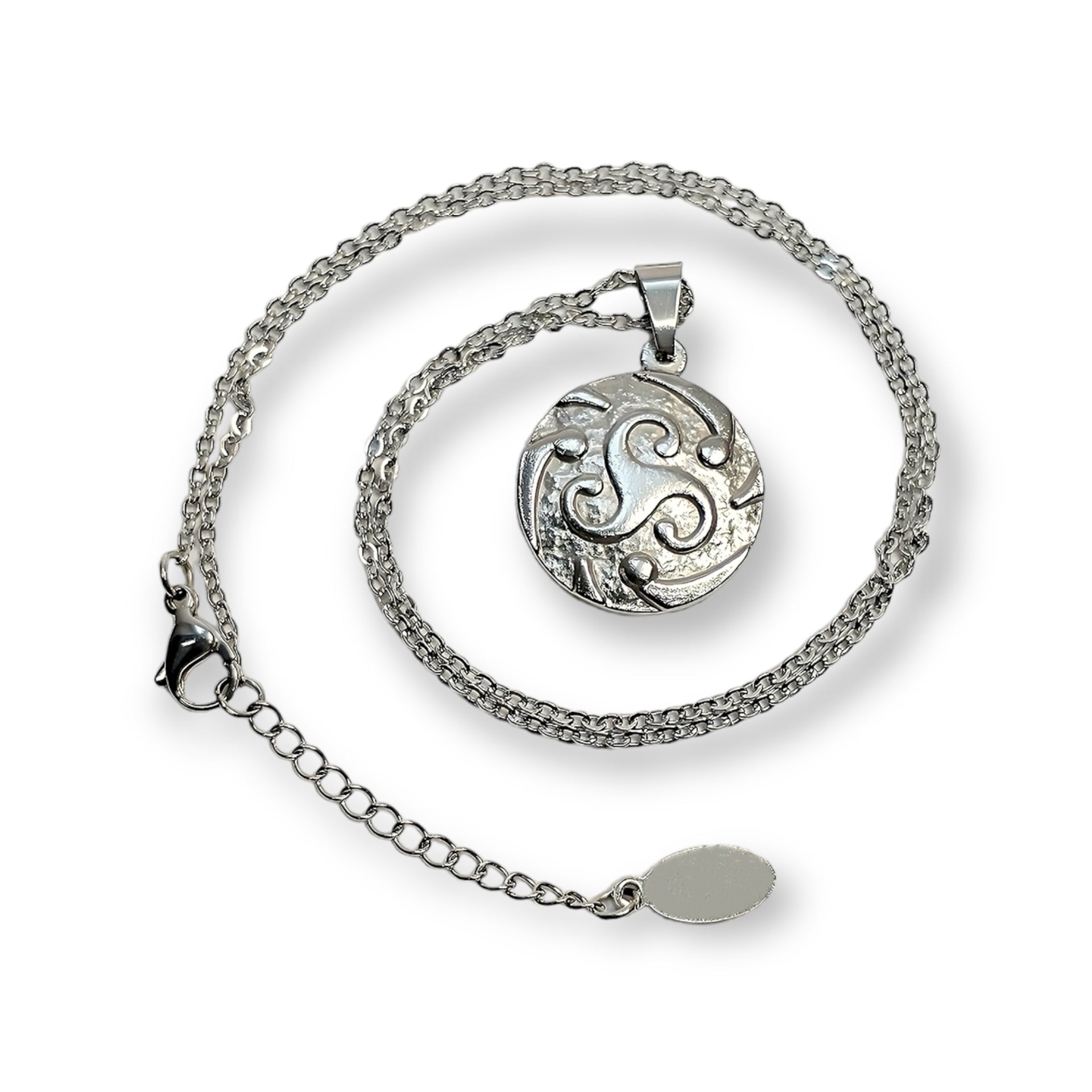 Here is the magnificent “ Céleste ” chain, 22 inches, decorated with a beautiful round pendant with the symbol of Triskel, adjustable with an extension decorated with a round charm 25 x 30 mm . All in hypoallergenic silver stainless steel .