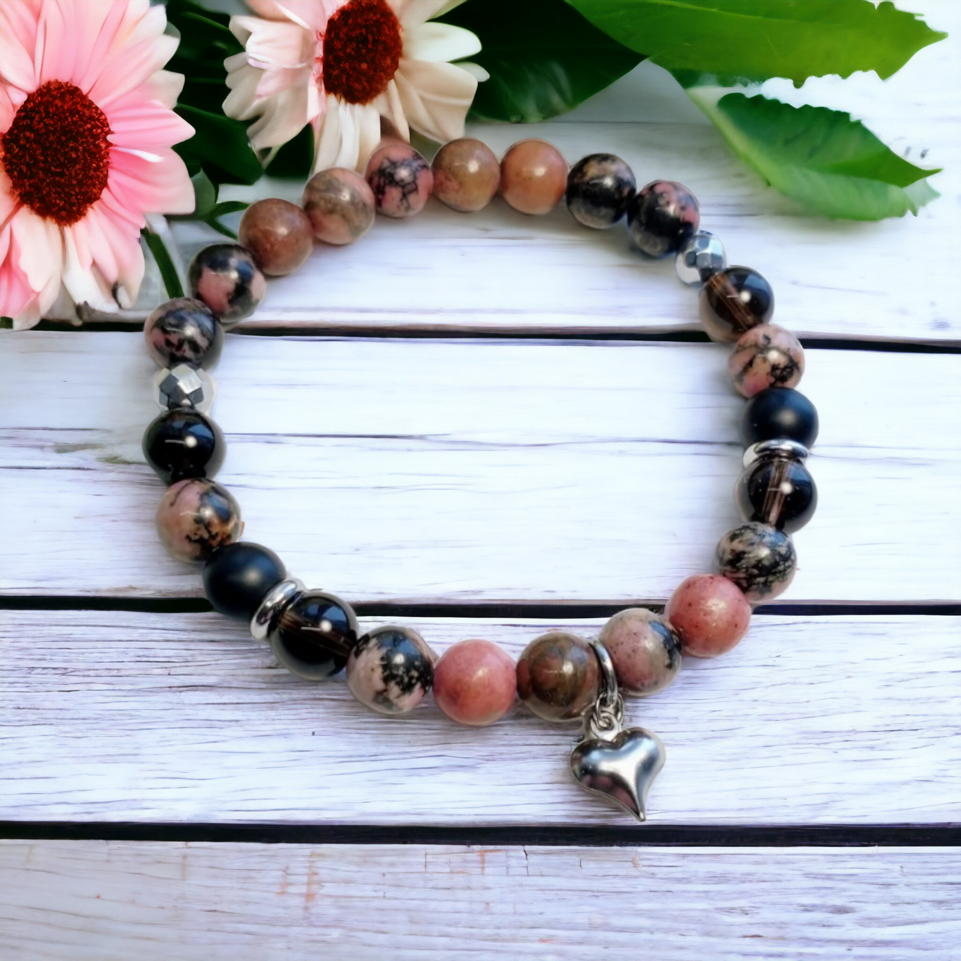 Here is the superb " Chloé" elastic bracelet, made of 6 mm faceted hematite stone, onyx , smoky quartz & rhodonite 8 mm. It is decorated with a magnificent heart-shaped charm in silver stainless steel .