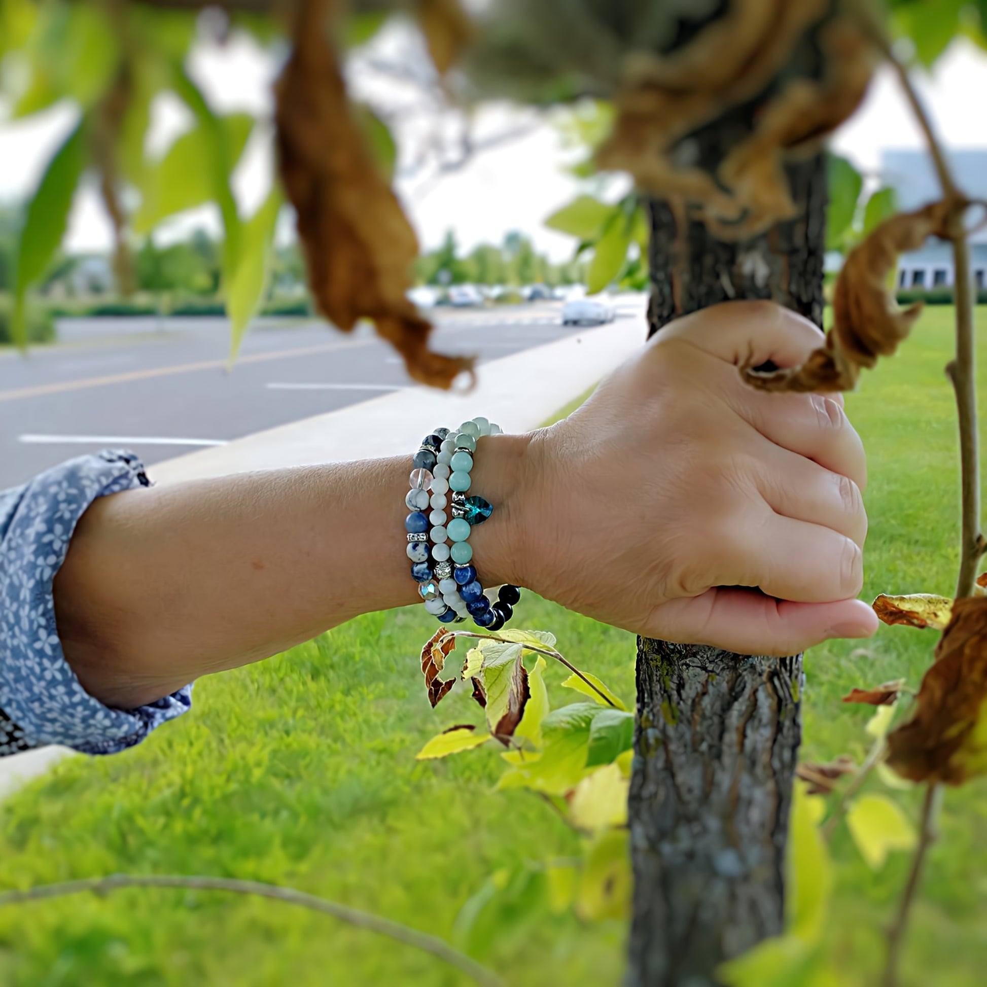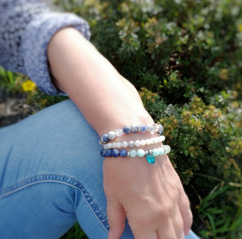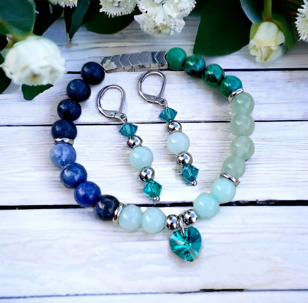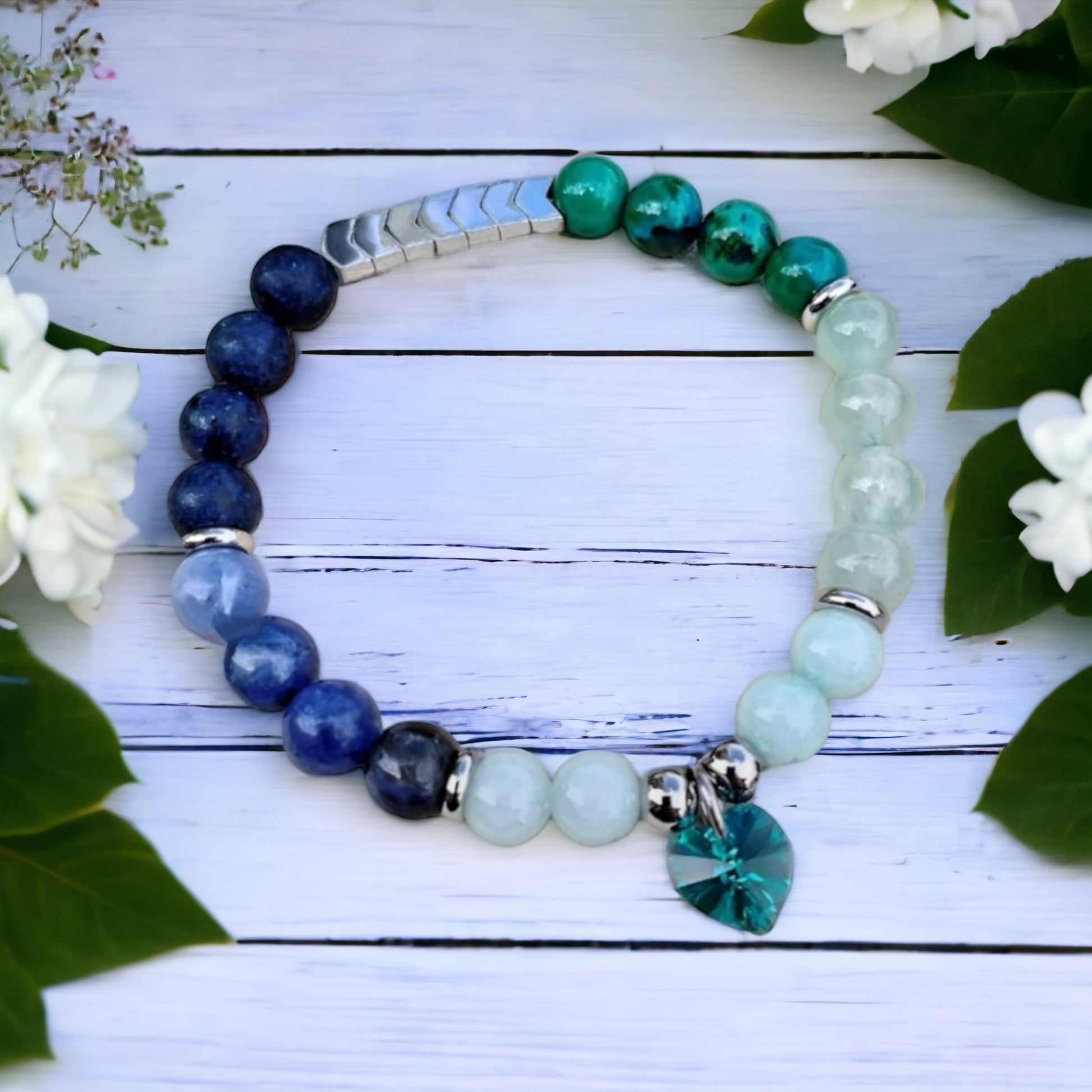 Here is the sumptuous "Claire" elastic bracelet, made of amazonite stone, aventurine, chrysocolla, lapis lazuli, sodalite 8 mm and chevron hematite beads silver color. It is decorated with 6 mm beads and silver stainless steel spacers and a magnificent 10 mm Turquoise Swarovski zircon heart-shaped charm.