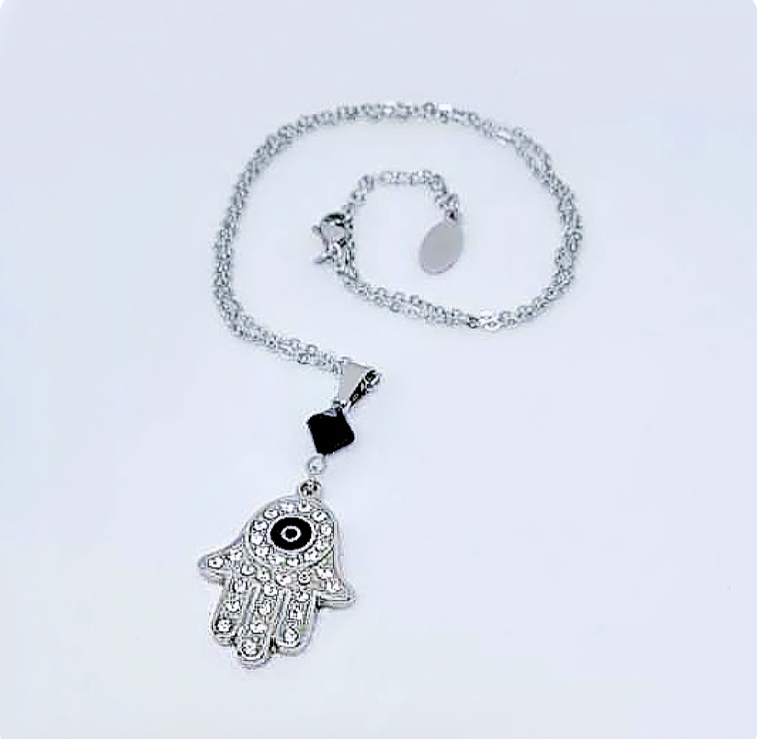 Here is the sublime " Haven " chain, in hypoallergenic silver stainless steel , adjustable with an extension decorated with an oval charm . It is decorated with a black Swarovski ball and an elegant pendant, in the shape of the hand of Fatima 31 x 24 inches, adorned with zircons.