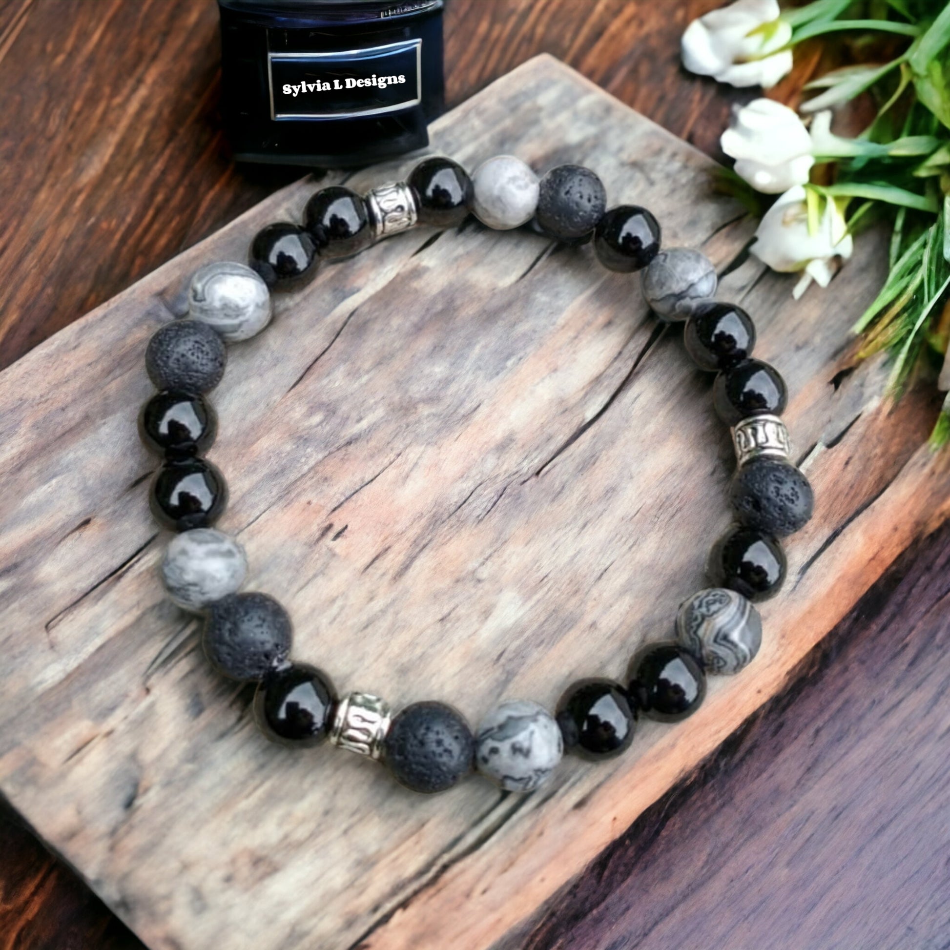 Here is the sublime “Rocker” elastic bracelet, made of stone onyx , jasper & lava stone 8 mm. It is decorated with pretty silver-colored decorative inserts. This bracelet is a must-have, perfect for all occasions.