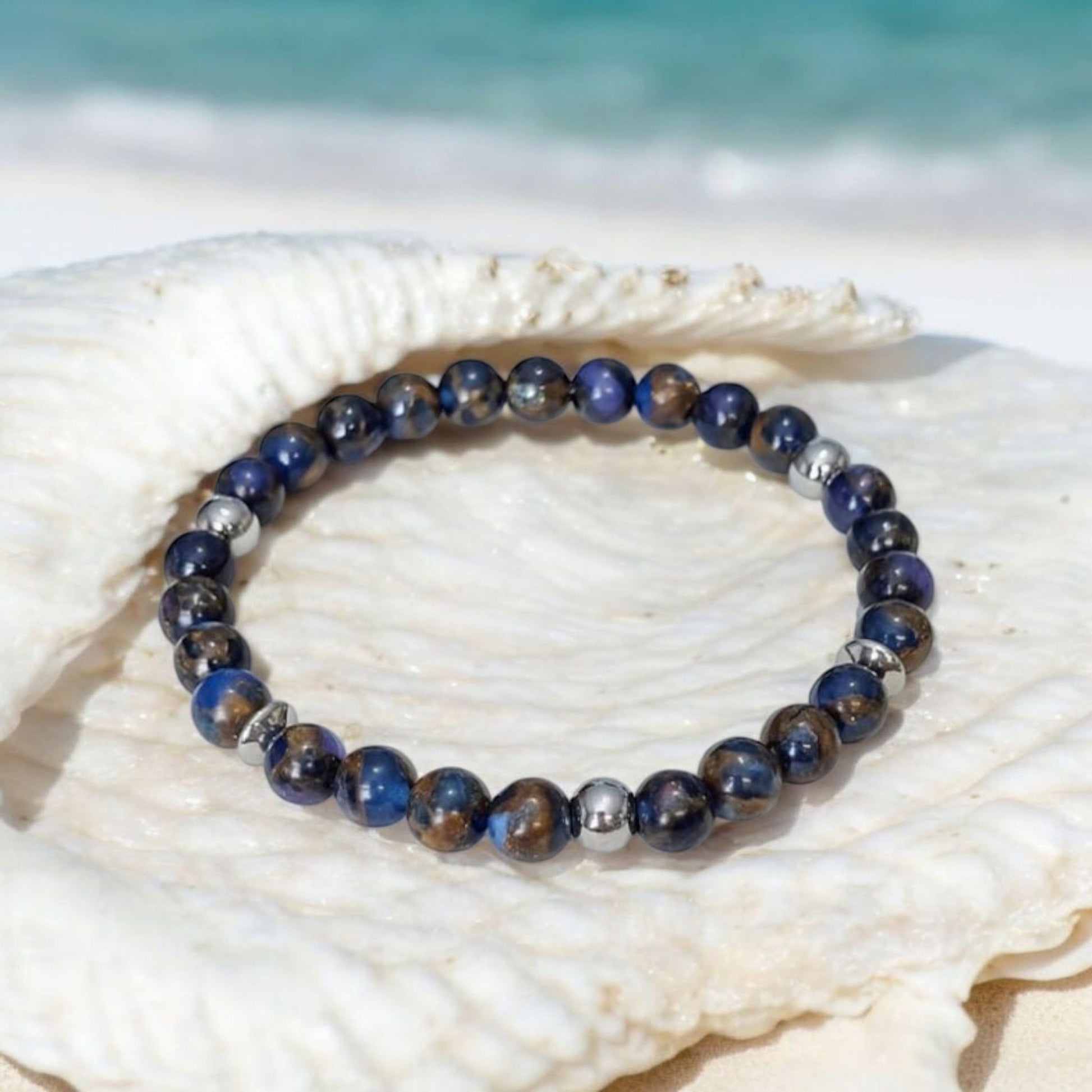 Here is the magnificent "Escale" elastic bracelet, made of 6 mm sapphire jasper stone. It is decorated with silver stainless steel balls & inserts.