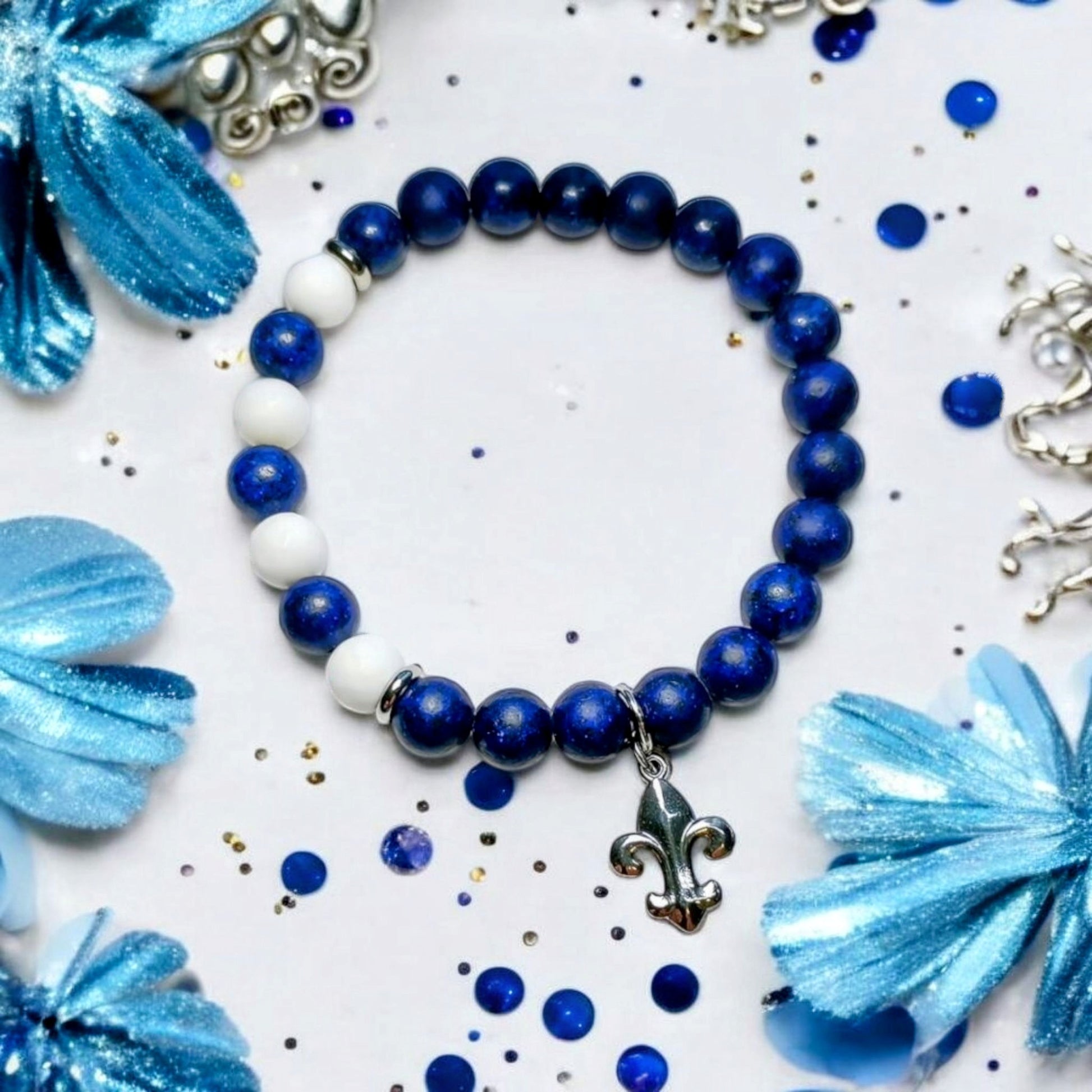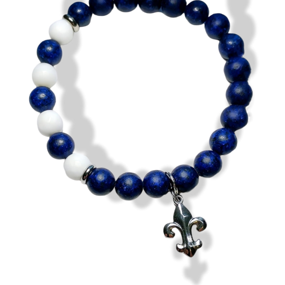 Here is the beautiful elastic bracelet "Fleur de lys", composed offaceted agate stone and 8 mm lapis lazuli . It is decorated with silver stainless steel washers and a silver stainless steel lily-shaped charm.