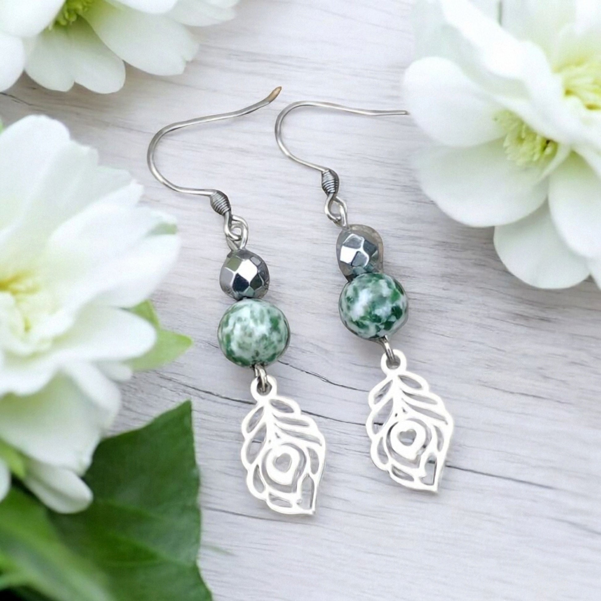 Here are the pretty “ Forest” earrings , made with hypoallergenic stainless steel silver hooks , stones agate tree 8 mm and silver plated faceted hematite 6 mm. They are decorated with a pretty peacock feather charm, in silver stainless steel .