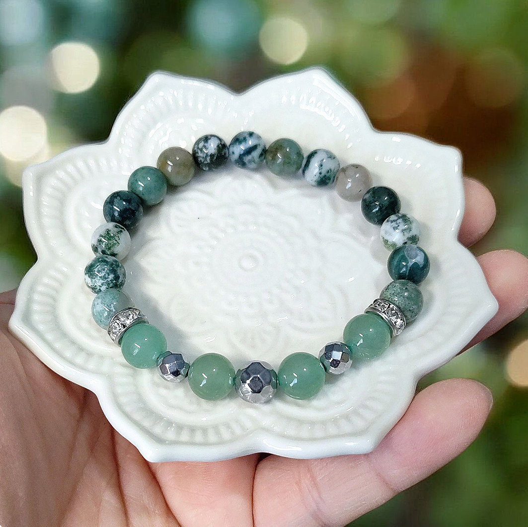 Here is the “Sapin” elastic bracelet made of stone agate tree, aventurine, silver-plated faceted hematite and silver-plated lava stone beads. It is decorated with pretty surgical stainless steel rhinestone washers.