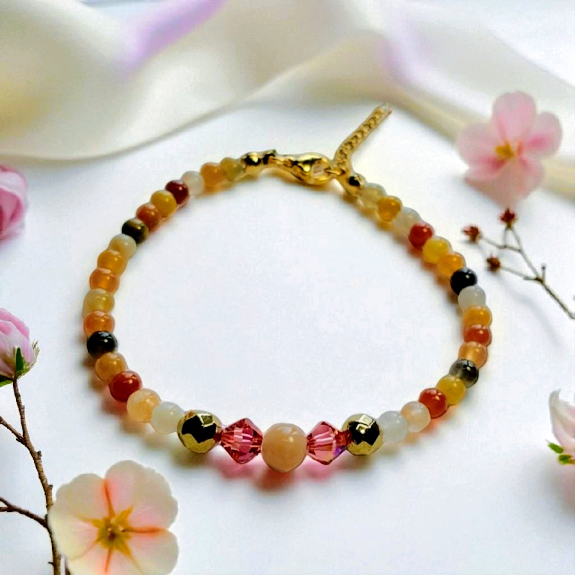 Here is the beautiful "Janella" elastic bracelet, mounted on an elastic, fasteners and extension in gold hypoallergenic stainless steel . It is composed of golden faceted hematite 8 mm and mixed jasper 6 & 8 mm. It is decorated with Swarovski crystal bicone beads.