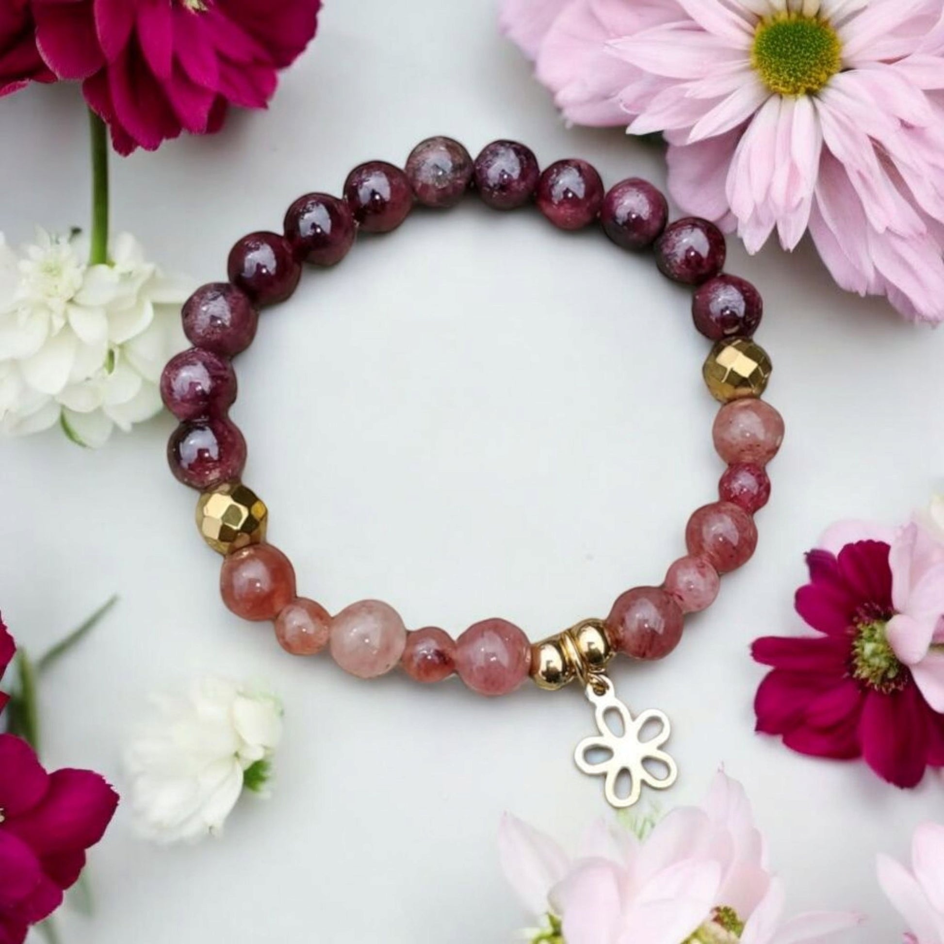 Here is the beautiful "Joie de vivre" elastic bracelet, composed of 8 mm golden faceted garnet , strawberry quartz and hematite stones . It is decorated with pearls and a flower-shaped charm, in golden stainless steel . .