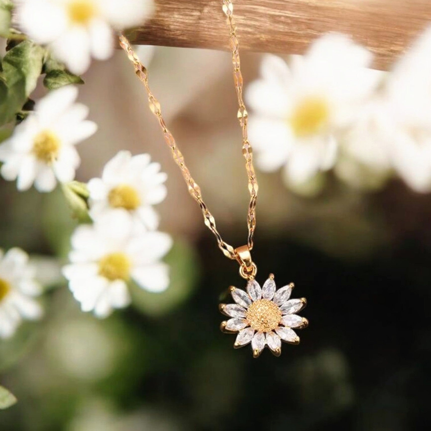 Voici le collier "Maisie", 15.5 po avec rallonge, en acier inoxydable hypoallergénique doré. Il est décoré, d'un magnifique pendentif en forme de fleur avec zircons, en acier inoxydable hypoallergénique.