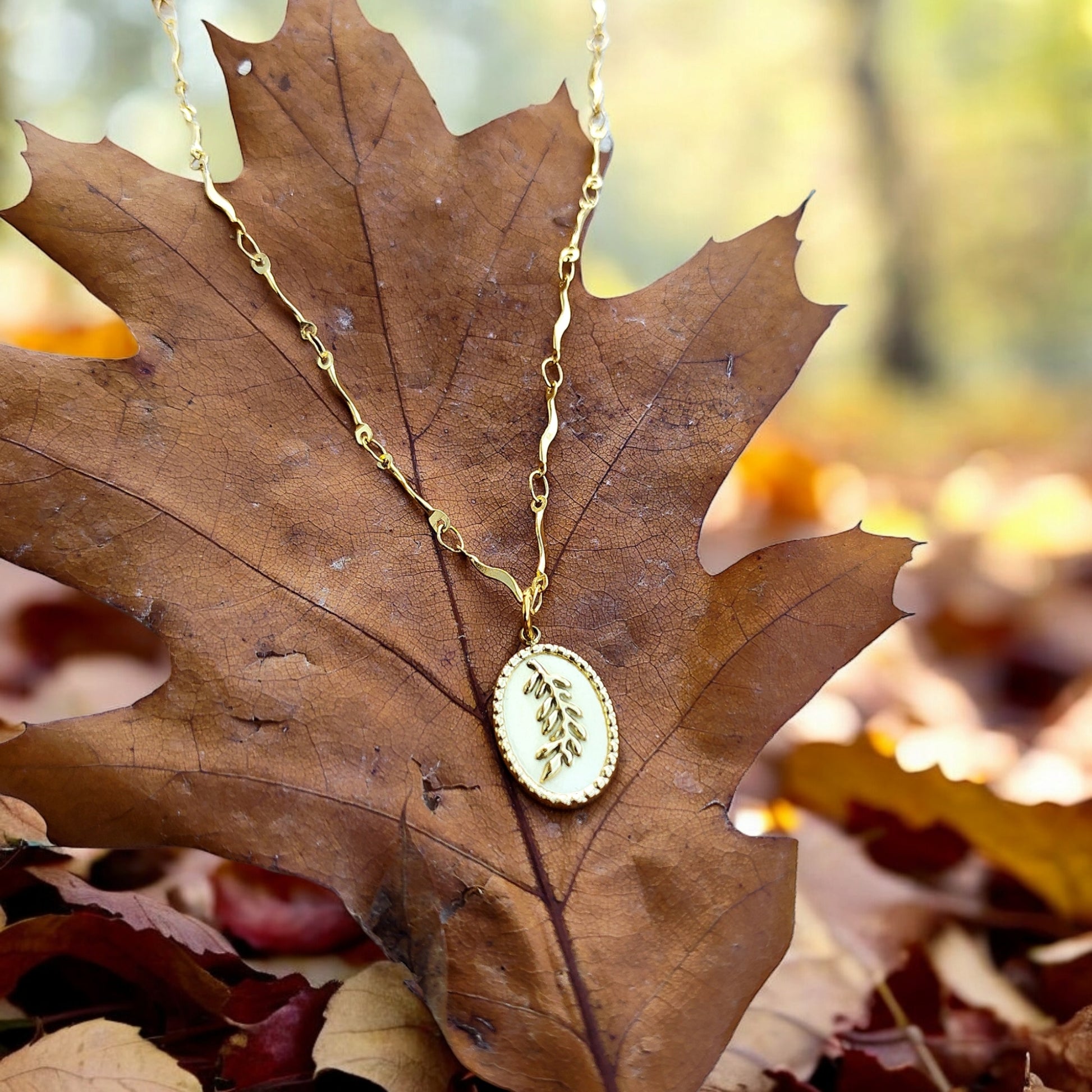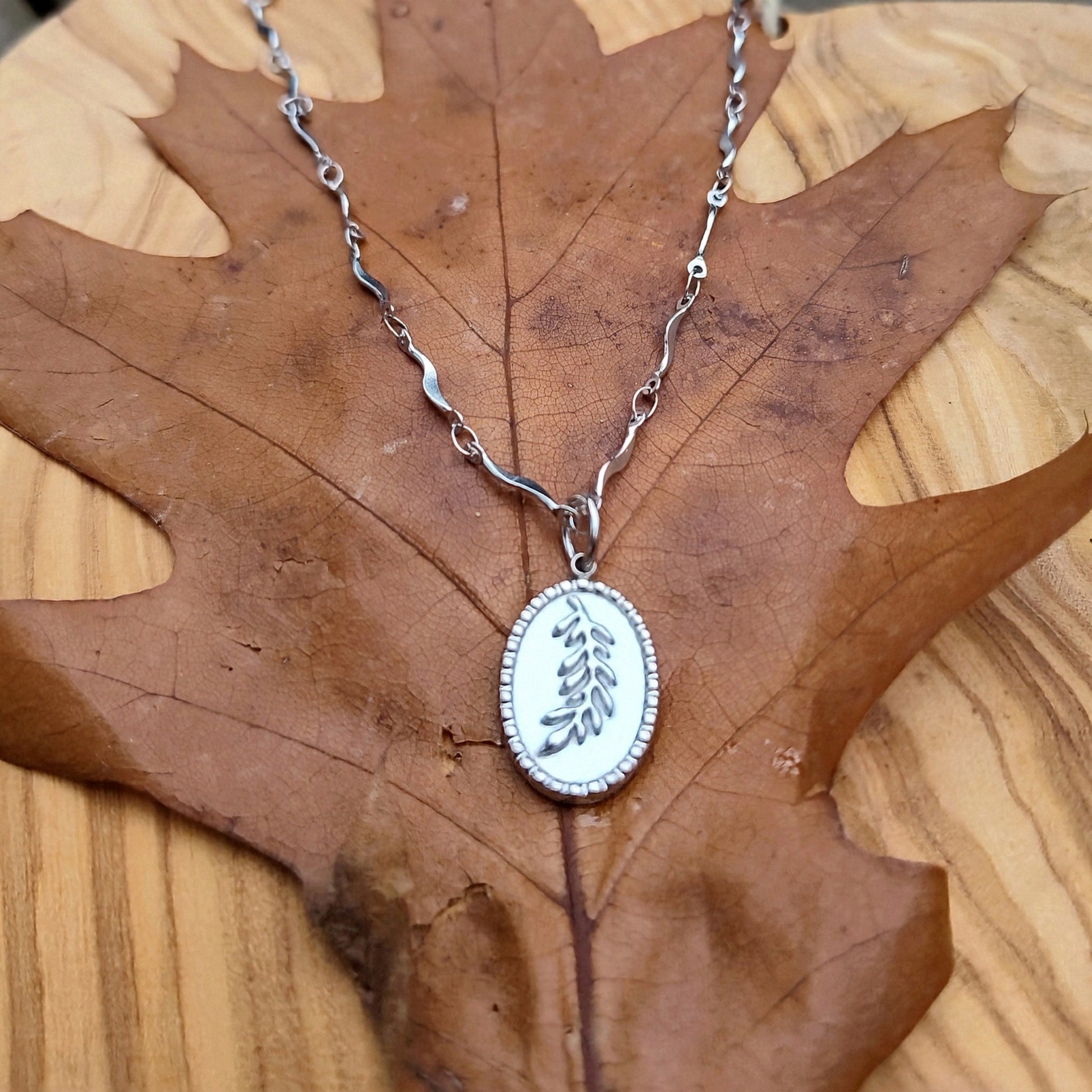 Voici le collier "Hortense", en acier inoxydable hypoallergénique. Il est décoré, d'un magnifique pendentif ovale, à motif de feuille 13 x 20 mm, en acier inoxydable hypoallergénique.