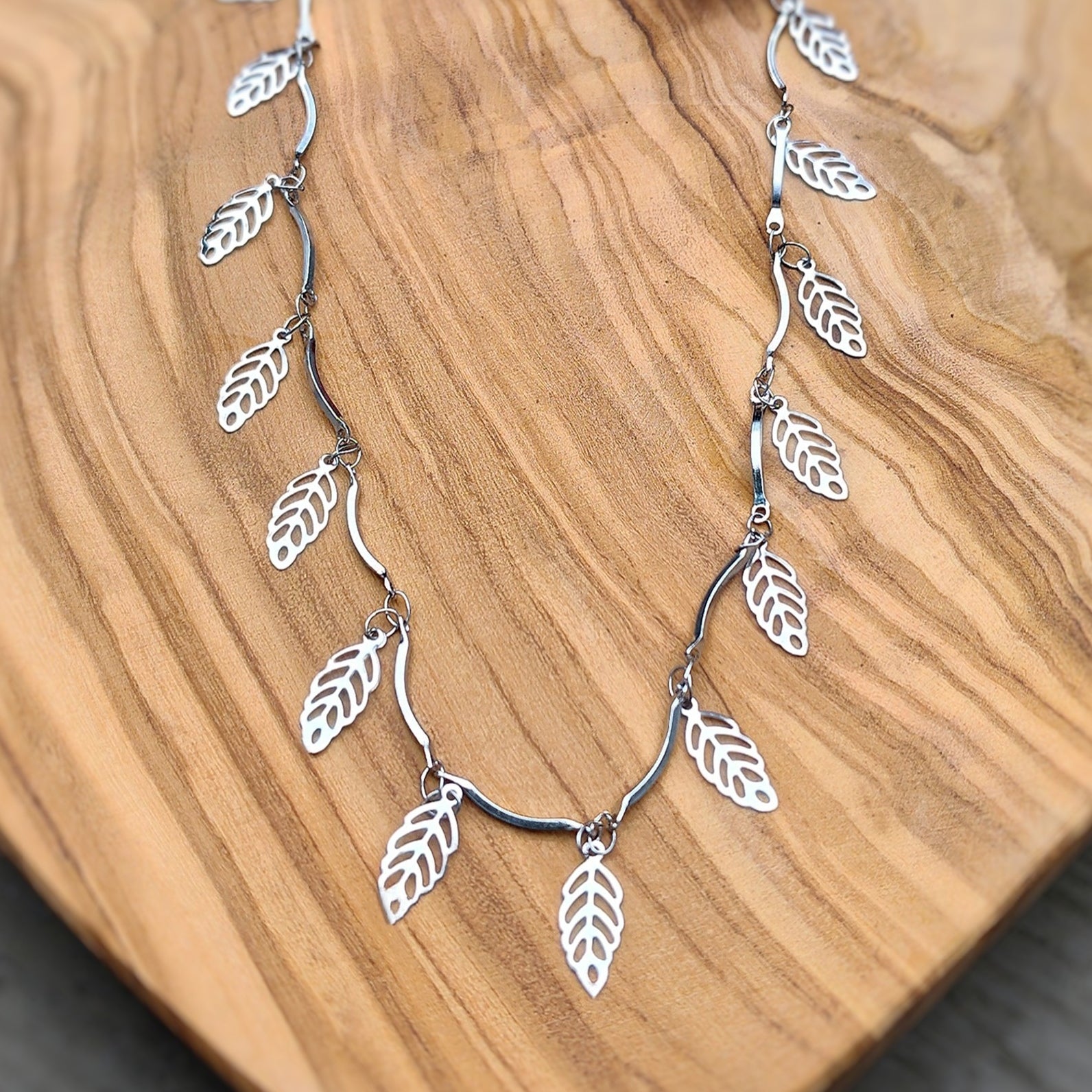 Voici la magnifique chaîne "Feuillage", en acier inoxydable hypoallergénique. Elle est décorée, de belles breloques, en forme de feuille, en acier inoxydable hypoallergénique. Cette chaîne est vraiment splendide pour rehausser un look, tout en douceur.