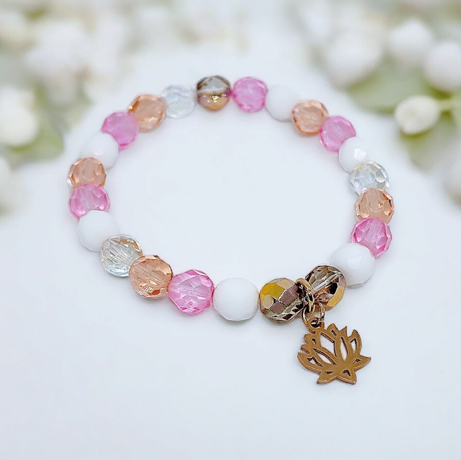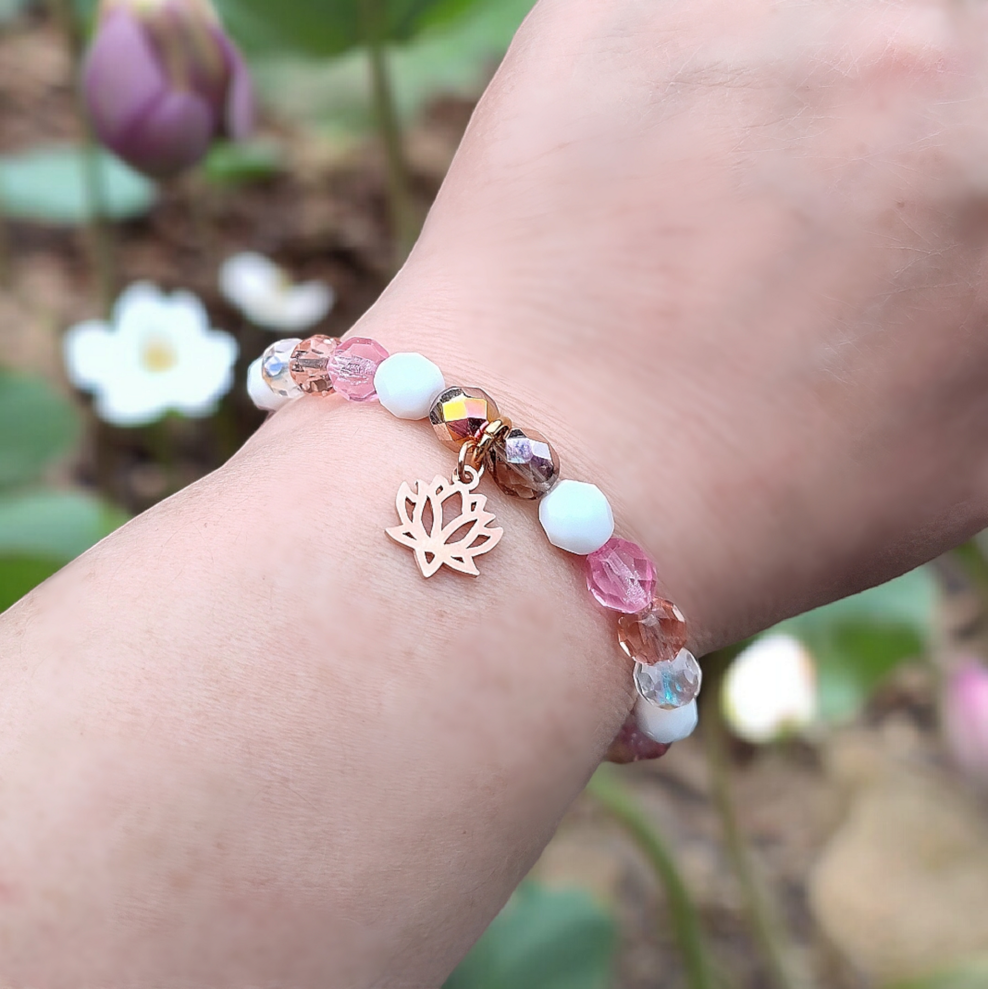 Voici le beau bracelet "Krystella", composé de perles de cristal de verre tchèque, à facettes, blanche, pêche, rose et transparent 8 mm. Il est décoré d'une jolie breloque d'une fleur de lotus, en acier inoxydable rosegold. Pour faire un ensemble de cristaux parfait, agencez-le avec le bracelet Krystel.