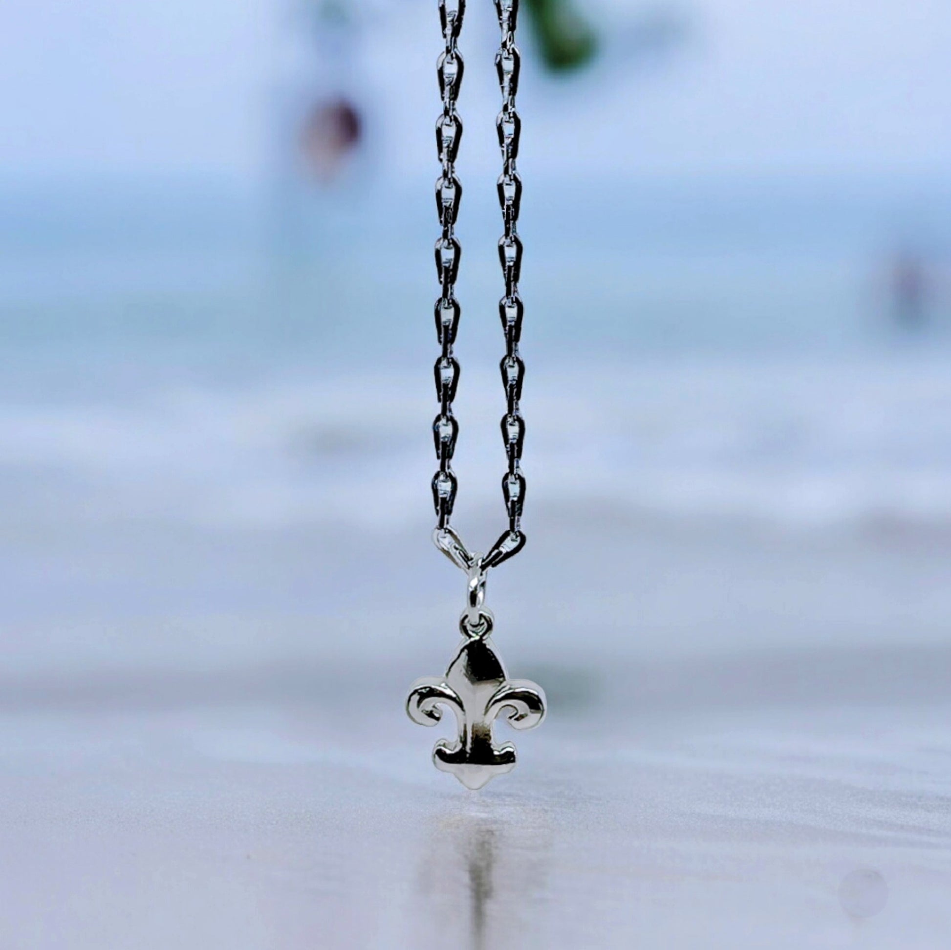 Voici la superbe chaîne "Lys", 18 pouces, décorée d'un beau pendentif de fleur de lys, en acier inoxydable hypoallergénique.