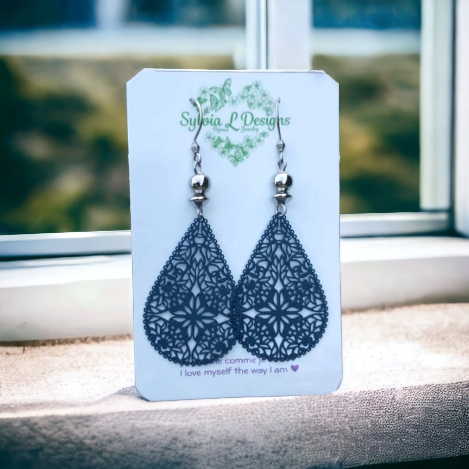 Here are the superb " Tide " earrings, made with hypoallergenic silver stainless steel hooks, pretty, very light pendants, in the shape of tears cut into filigree 40 x 26 mm. They are made of enamel, marine stainless steel and silver stainless steel beads.