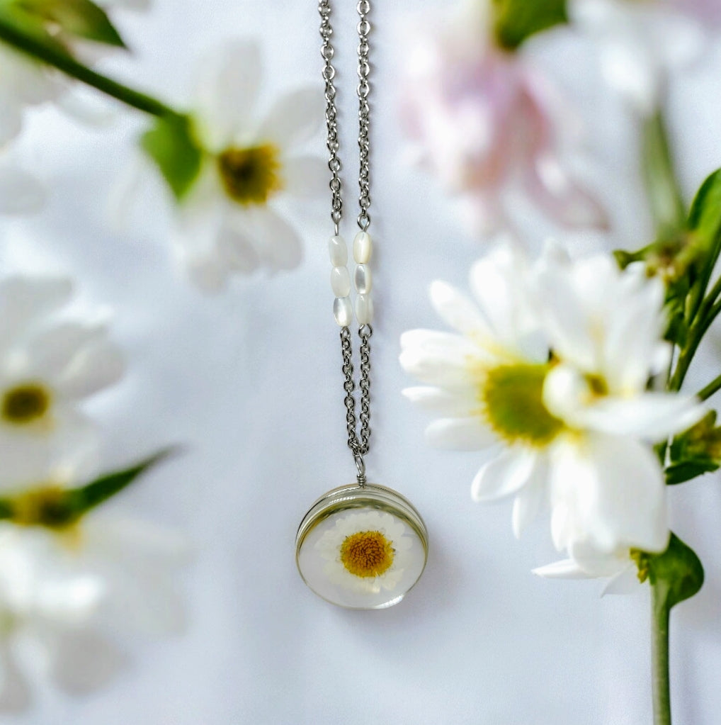 Portez un fragment de la nature avec ce magnifique collier "Meggy" en acier inoxydable hypoallergénique, ajustable et orné de perles de nacre et d'une véritable marguerite séchée dans un pendentif en résine.