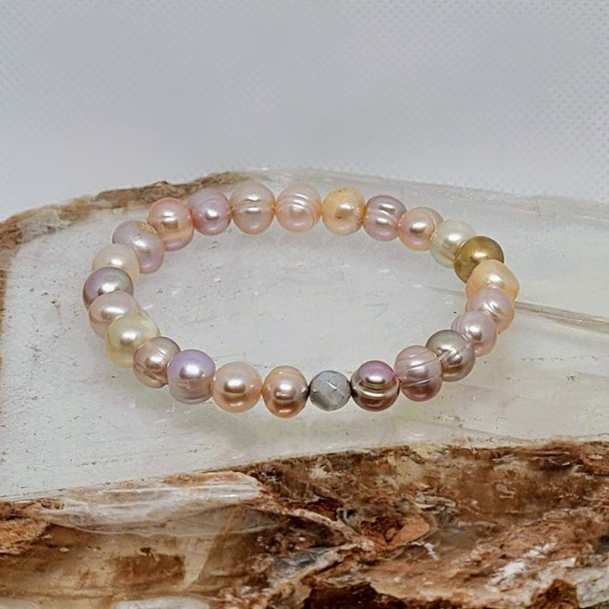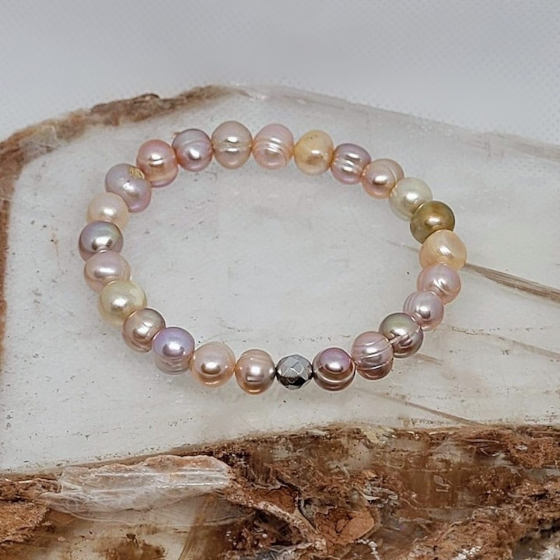 Here is the beautiful "Ottania" elastic bracelet, made of pink-lavender freshwater pearls. It is decorated with a pretty faceted hematite stone , silver colored 6 to 8 mm.
