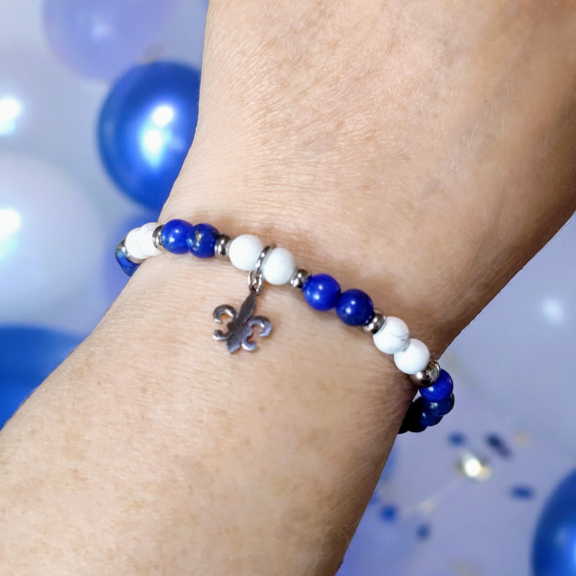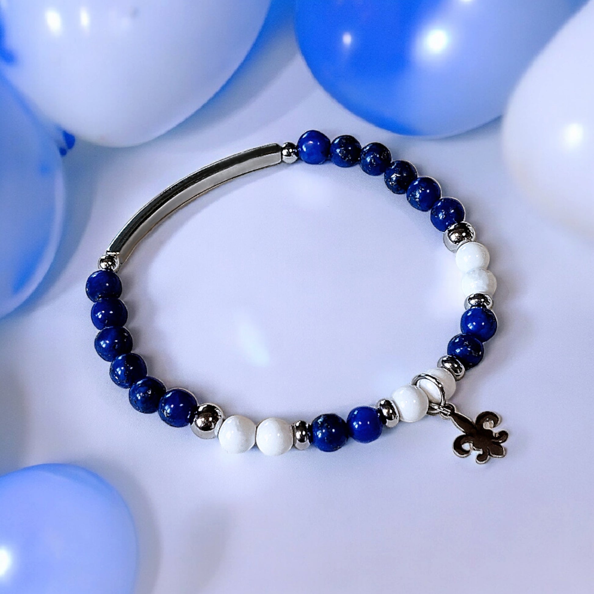 Voici le beau bracelet "fleurdelisé", composé de pierre d'howlite et lapis lazuli 6 mm. Il est décoré d'insertions et une breloque fleur de lys, en acier inoxydable.