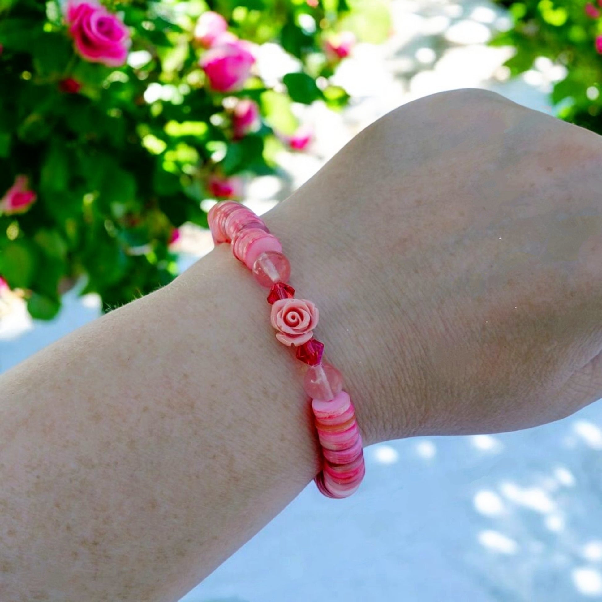 Here is the dynamic “Parfum de rose” elastic bracelet, made of 8 mm shell beads and cherry quartz . It is decorated with Swarovski crystal beads and a rose-shaped bead, made of quartzite stone.