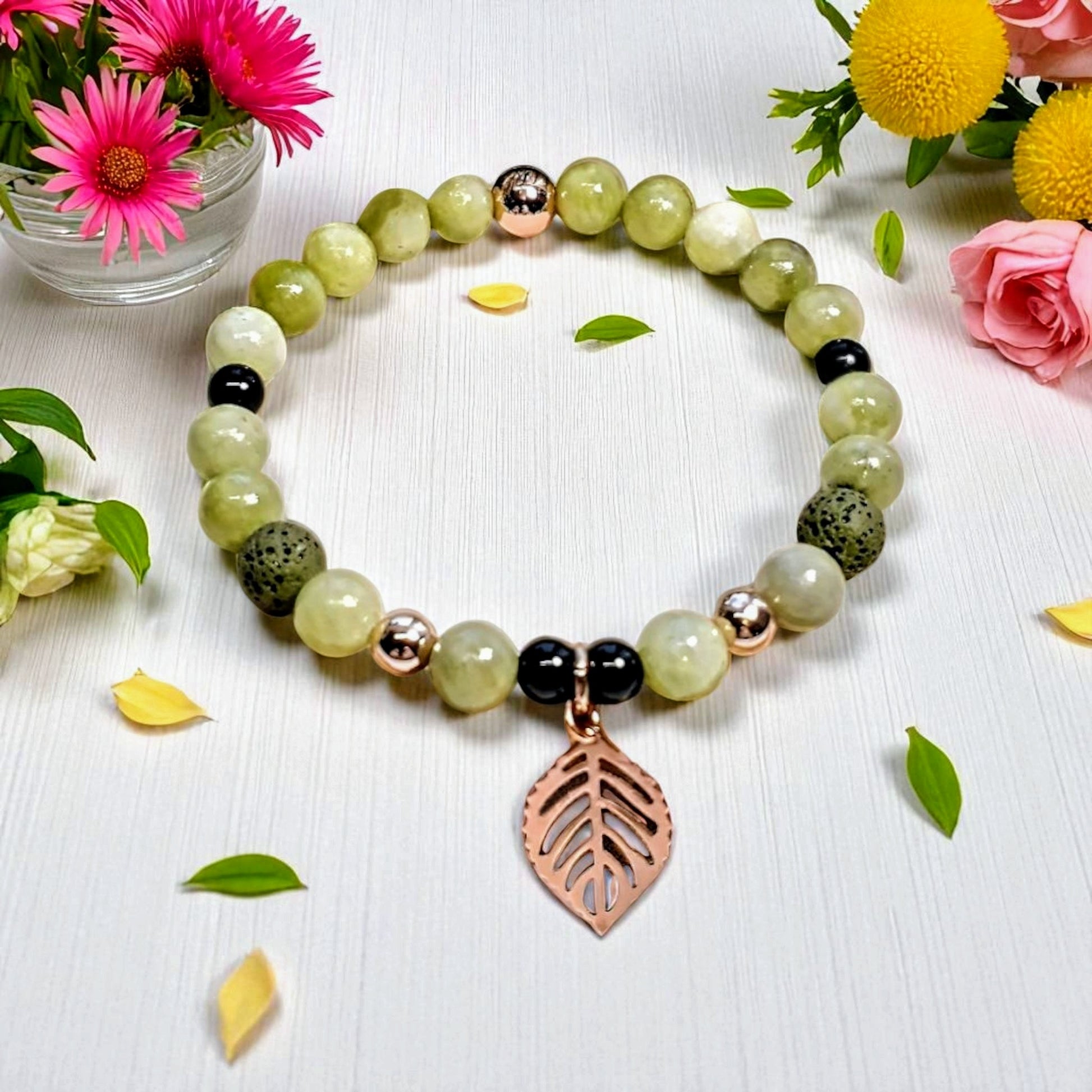 Here is the “Tendresse” elastic bracelet, made of black jasper stone 6 mm, rose gold hematite 6 & 8 mm, jade & volcanic stone 8 mm. It is decorated with a leaf-shaped charm, in rose gold stainless steel .