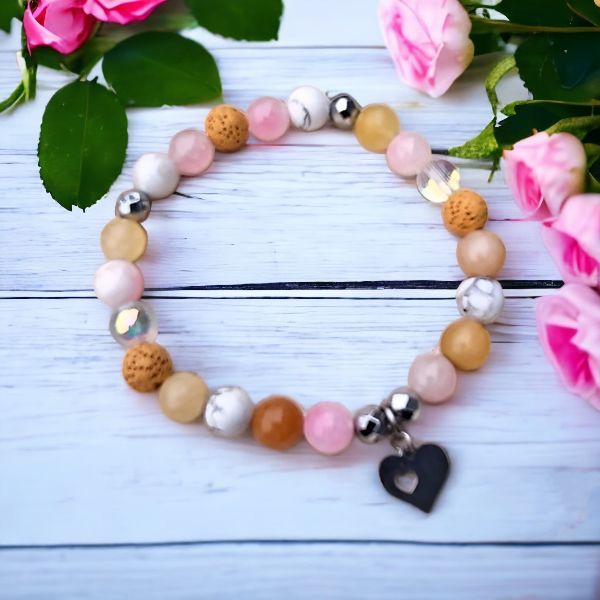 Here is the adorable "Bloom" elastic bracelet, made of howlite stone , yellow jade, pink jade, reconstituted moonstone , volcanic stone 8 mm & silver faceted hematite 6 mm. It is decorated with a pretty heart-shaped charm, in silver stainless steel .