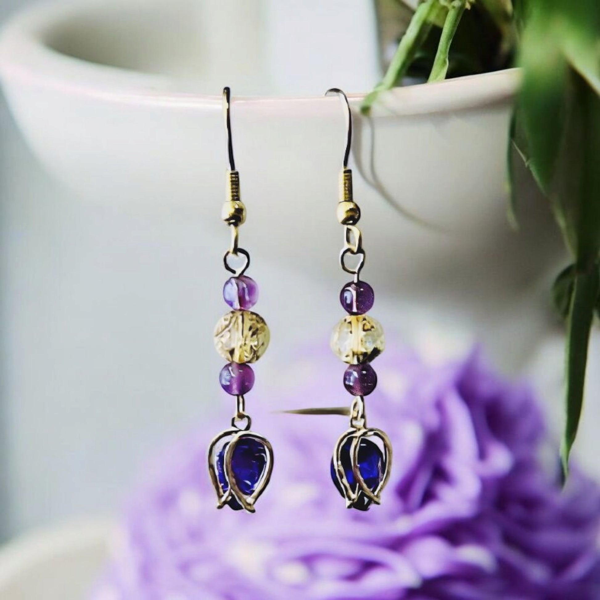 Voici les élégantes boucles d'oreilles "Tulipe", composées de crochets en acier inoxydable hypoallergénique. Elles sont ornées d'une pierre d'améthyste de 4 mm, d'une perle en verre tchèque polie au feu, à facettes dorées de 6 mm et d'une breloque en forme de tulipe en zircon violet.