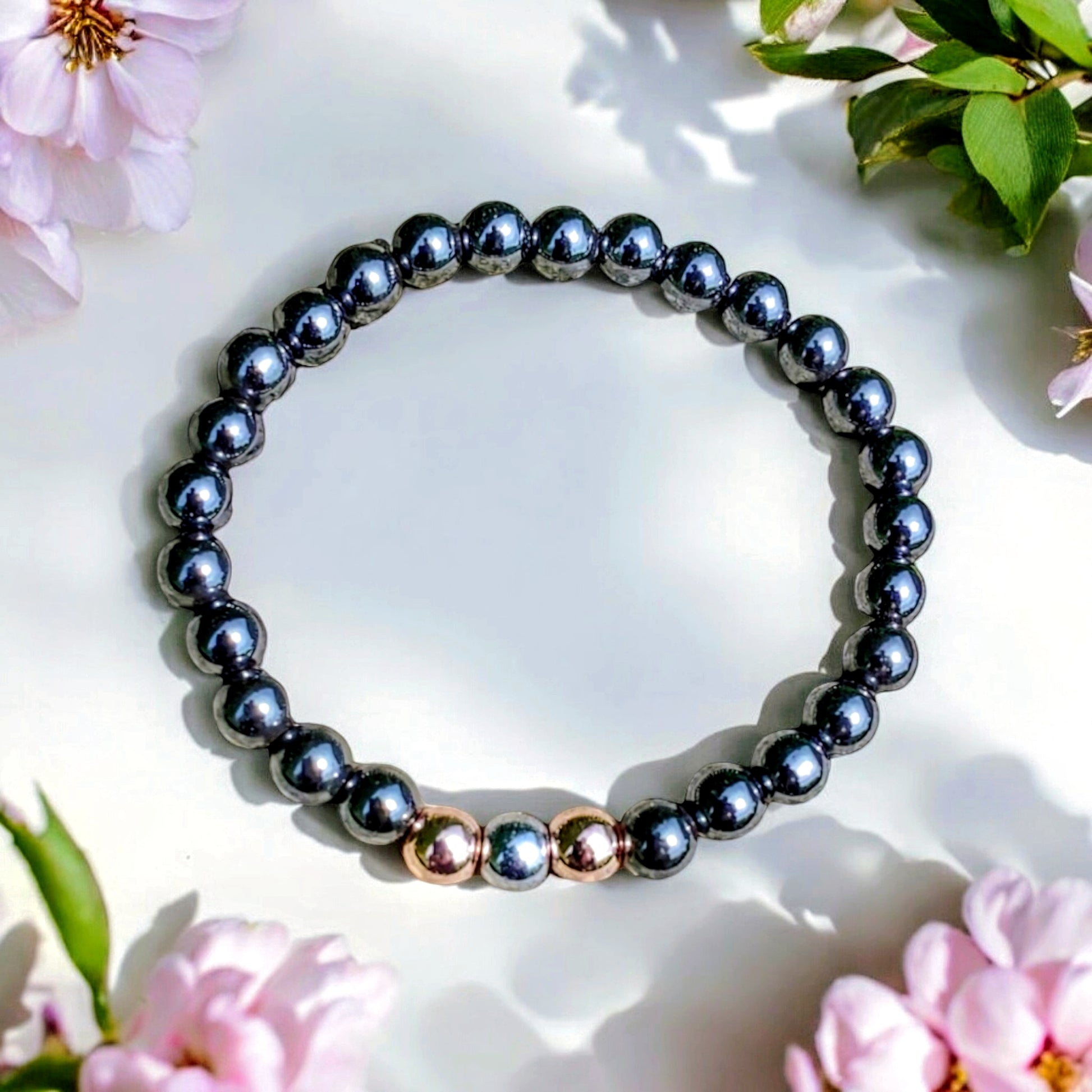Voici le resplendissant bracelet "Aimée", une belle création de ma fille Chloé.💜 Il est composé de pierre d'hématite noire, rose gold et hématite plaqué argent de 6 mm.