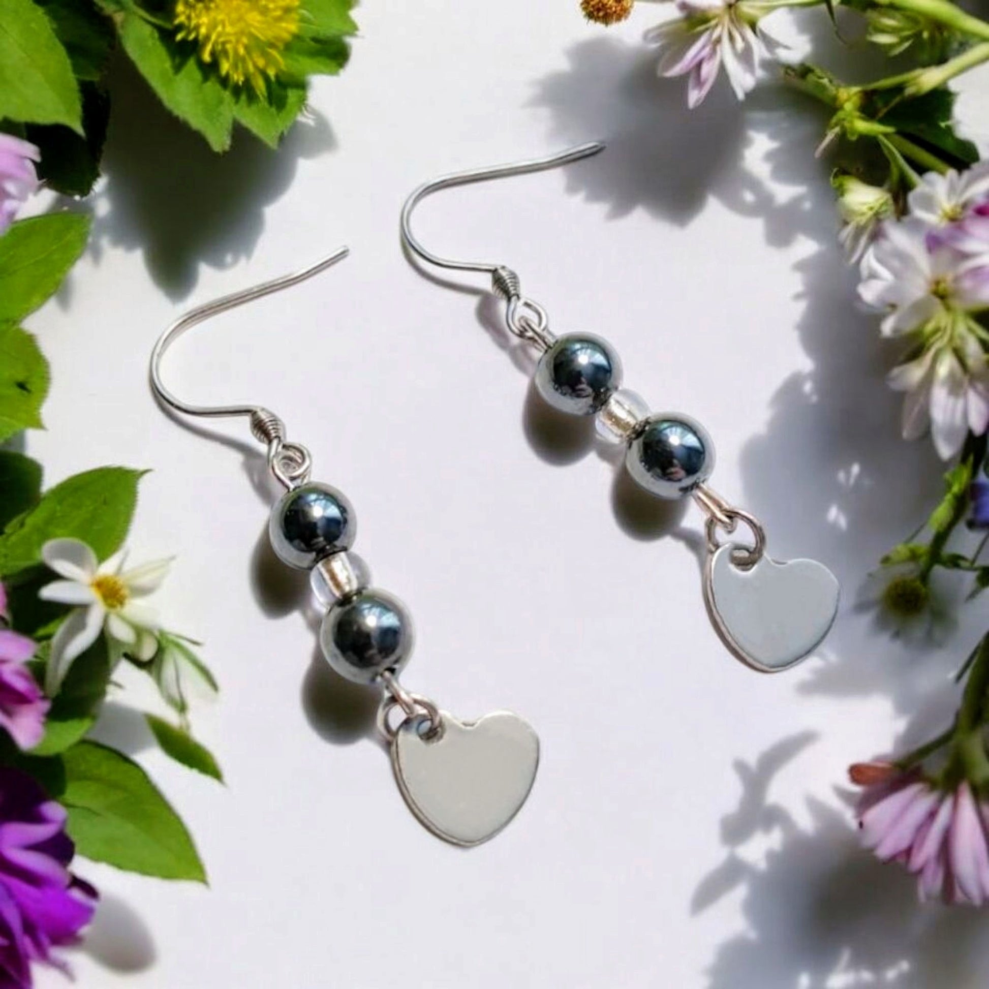 Voici les boucles d'oreilles "Amoureuses", faites avec des crochets en acier inoxydable argent, pierres d'hématite 6 mm et une jolie breloque en forme de coeur, en acier inoxydable.