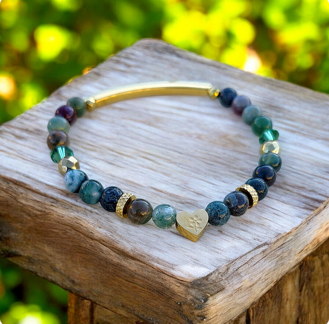 Découvrez le splendide bracelet "Amoureux de la forêt", composé de pierres d’agate indienne aux teintes variées, d’hématite dorée à facettes et de perles de Swarovski de 6 mm. Il est délicatement orné d’insertions raffinées et d’un charm en forme de cœur en acier inoxydable, symbole d’amour et d’harmonie.