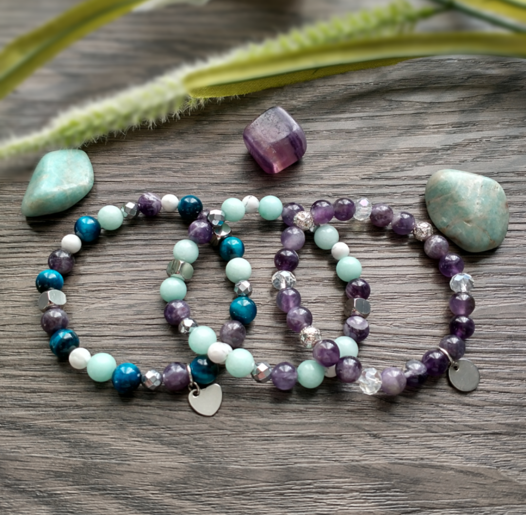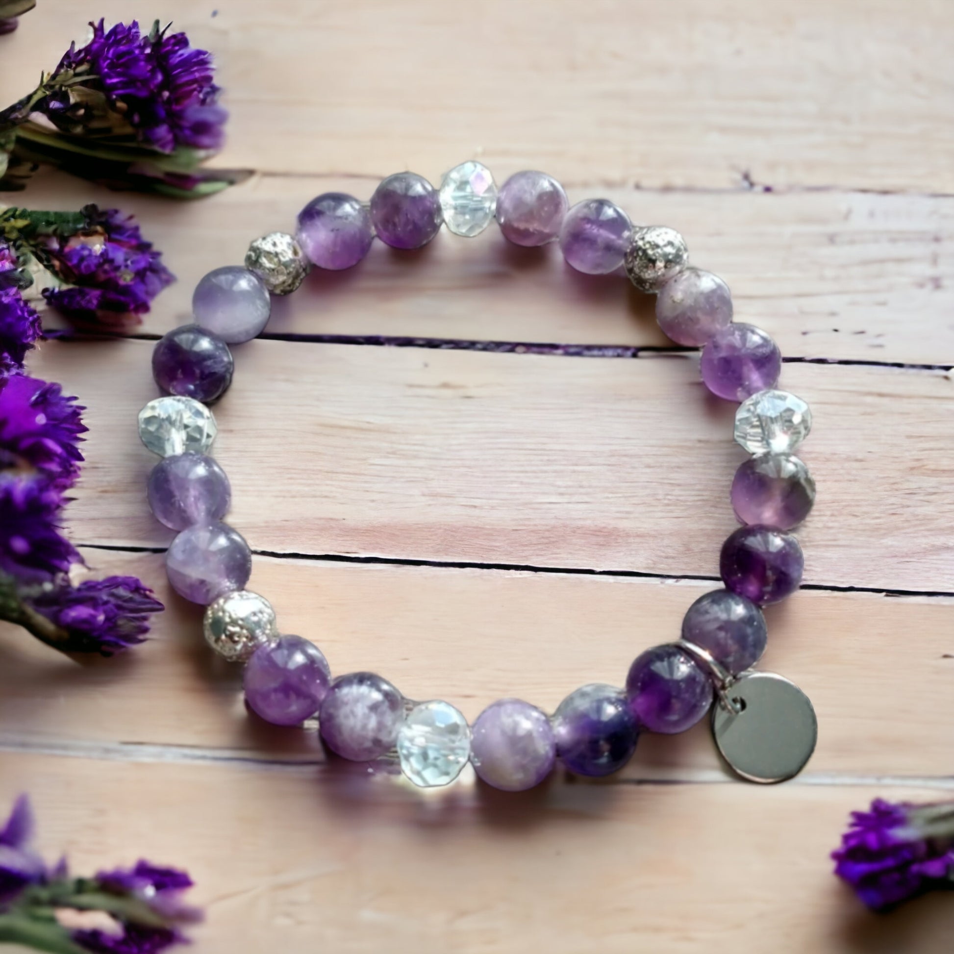 Voici le beau bracelet "Aubergine", fait de pierre d'améthyste et de pierre de lave galvanisé 8 mm. Il est décoré de perles de verre de cristal transparent et d'une jolie breloque circulaire en acier inoxydable.
