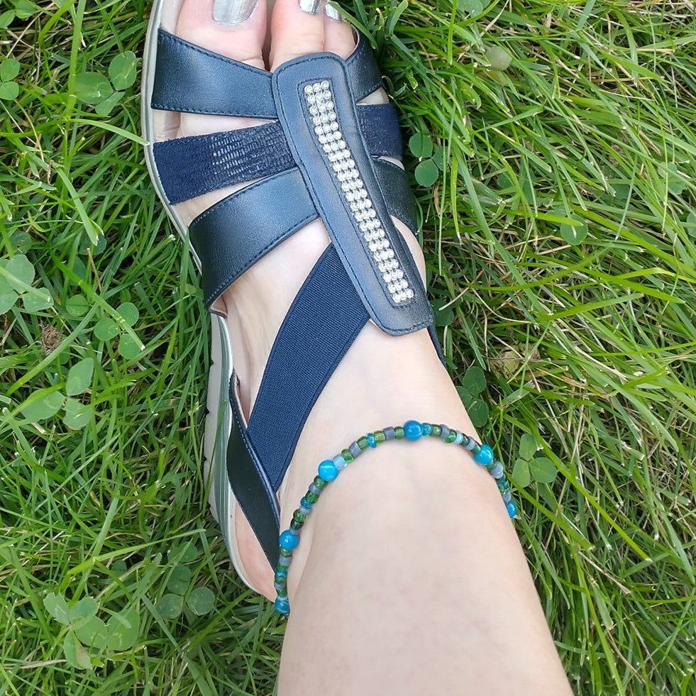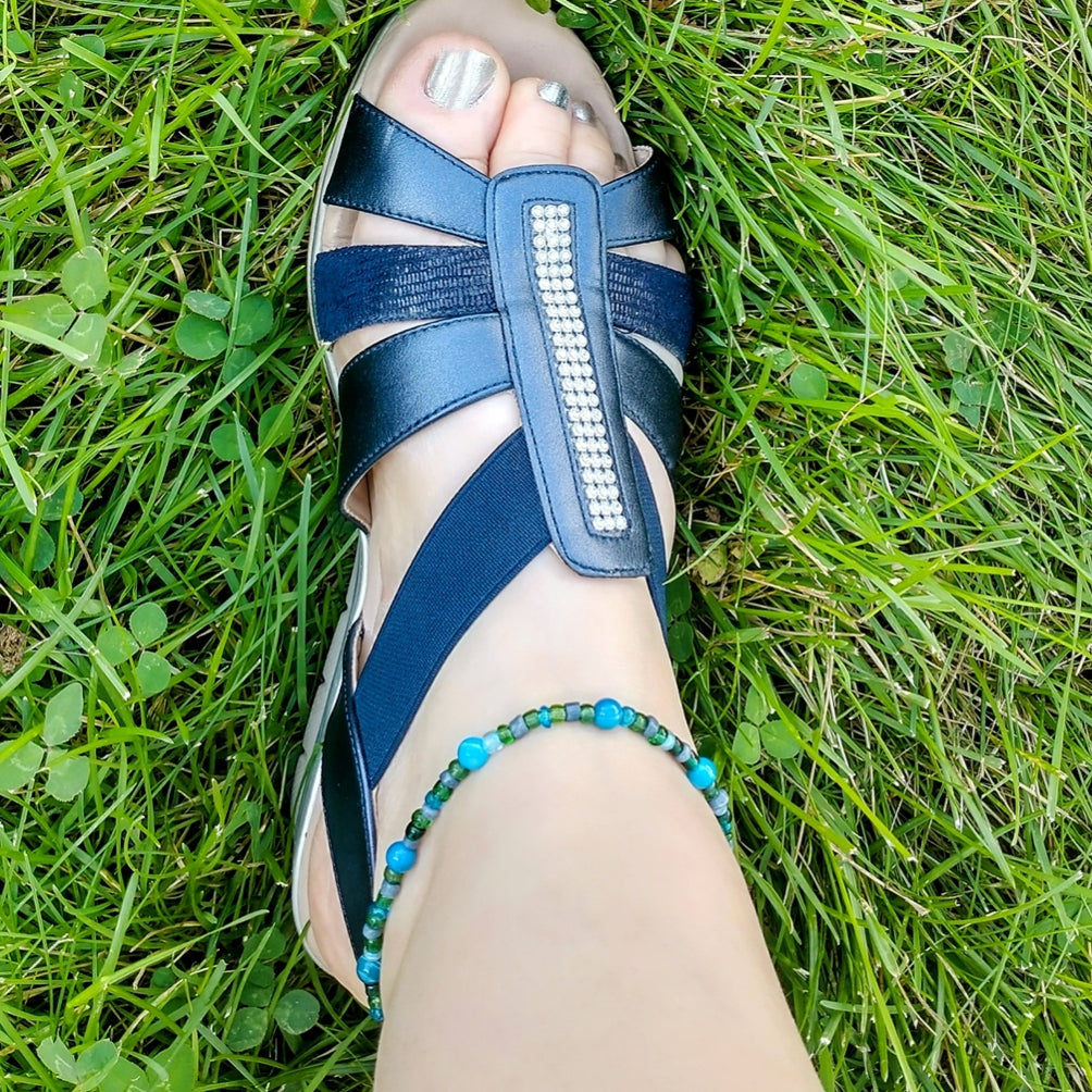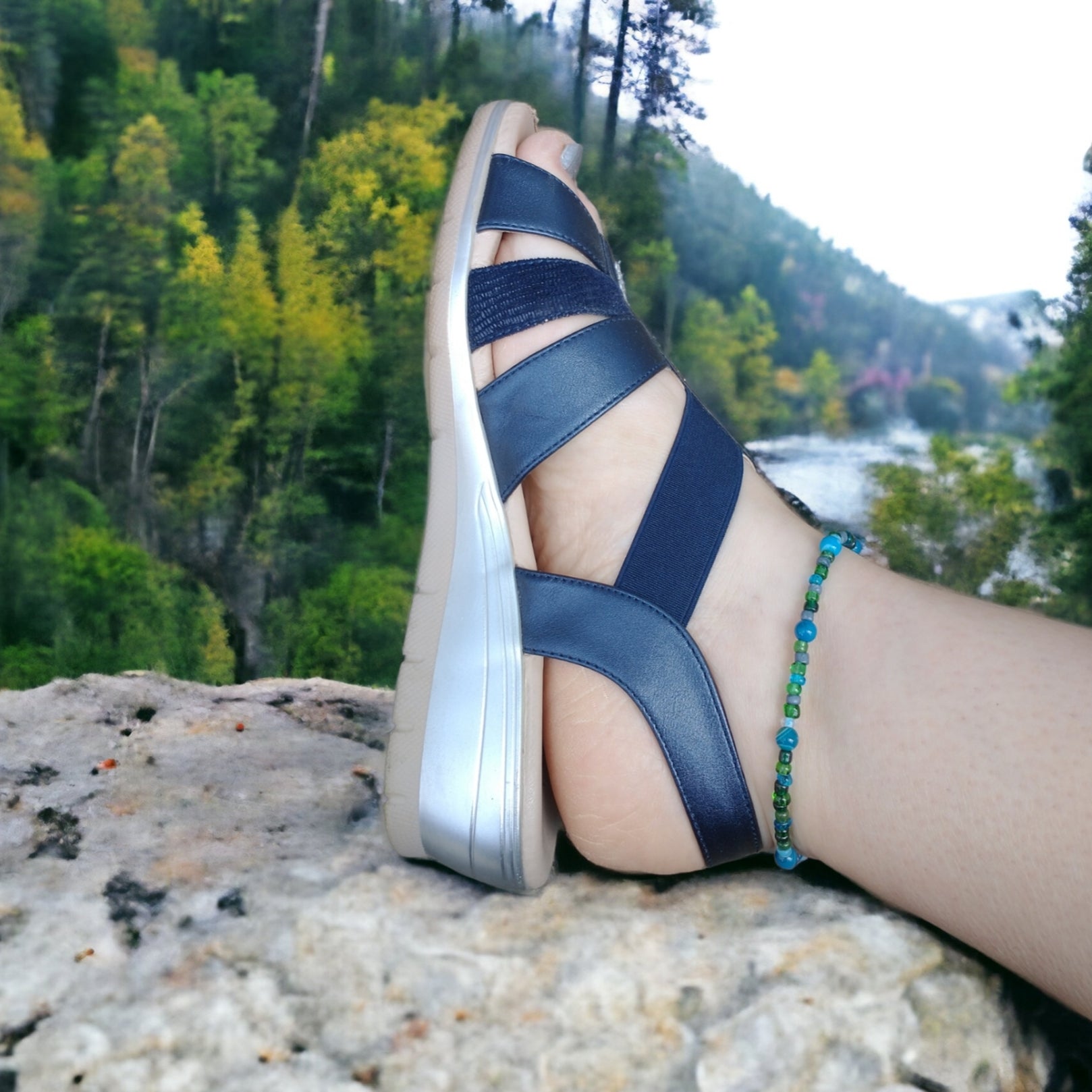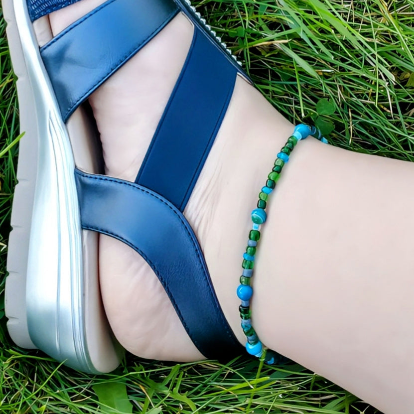 Voici le beau bracelet de cheville, "Blue Melody", monté sur un fil de nylon tressé de qualité, ajustable avec une rallonge en acier inoxydable argent. Il est composé d'agate à rayures bleues de 6 mm et perles de rocaille mixte.