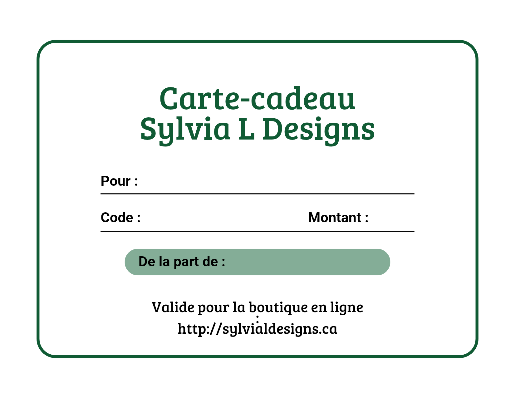 Carte-cadeau en papier : Si vous désirez l'offrir en papier, il s'agit simplement de l'imprimer et de remplir les sections manuellement. (N'oubliez pas d'inscrire le code de la carte-cadeau, lorsque vous la recevrez par courriel).