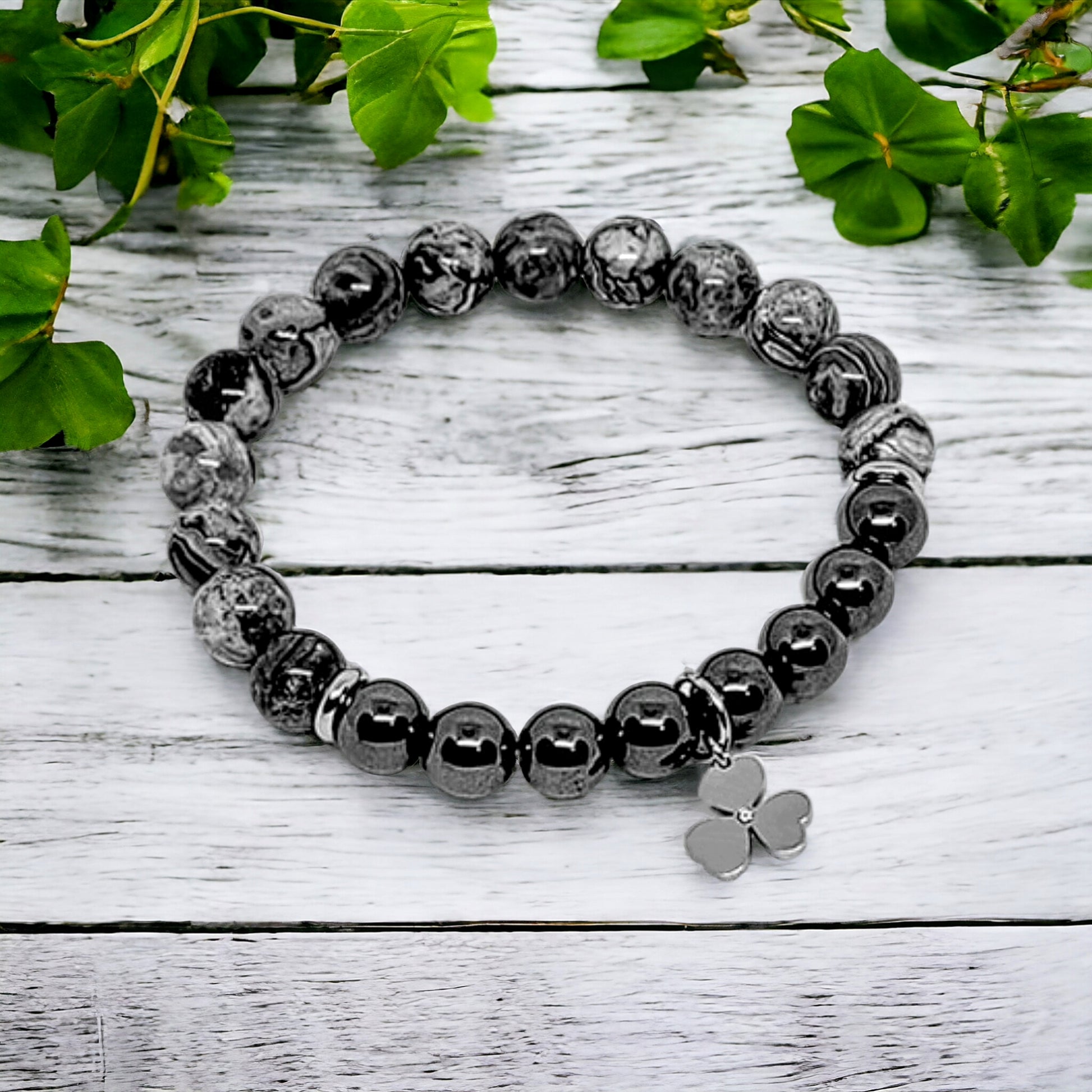 Découvrez le bracelet "Charm", une jolie création de ma fille Chloé 💜. Il est composé de pierres d’hématite noire et de jaspe de 8 mm, et orné d’une délicate breloque en forme de trèfle en acier inoxydable, sertie d’un zircon étincelant. Grâce à ses tons neutres, ce bracelet s’harmonise aisément avec toutes vos tenues, ajoutant une touche de charme et d’élégance à votre style.
