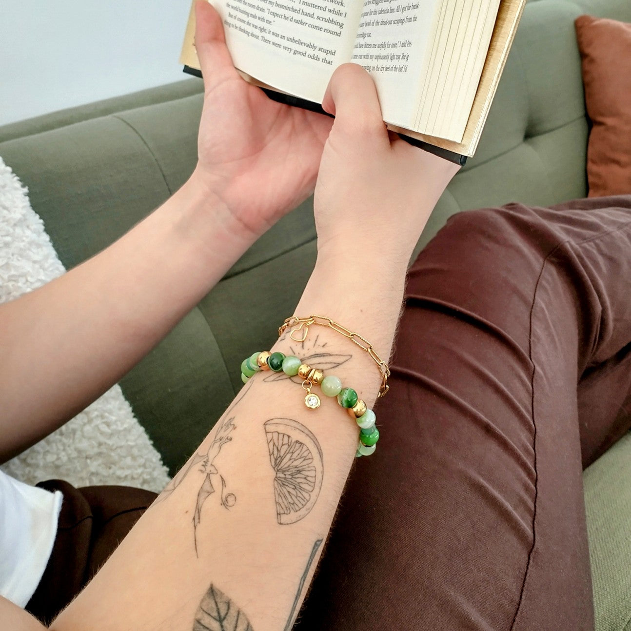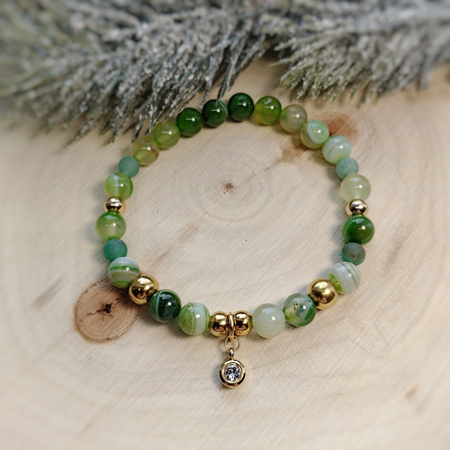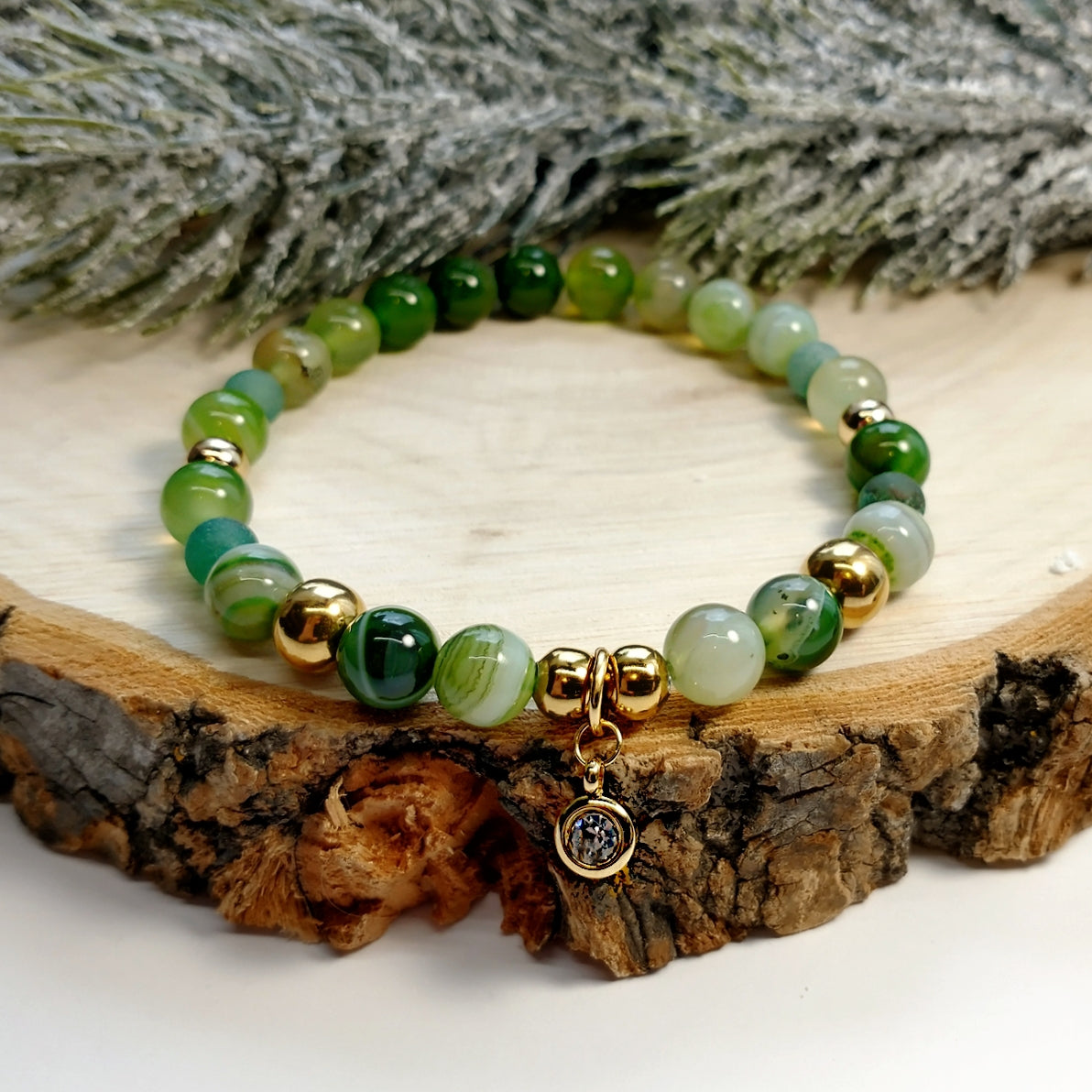 Voici le beau bracelet "Confiante", fait de pierre d'agate à rayures 8 mm et aventurine verte matte 6 mm. Il est décoré de billes & une jolie breloque en acier inoxydable doré, ornée d'une pierre du rhin couleur diamant.