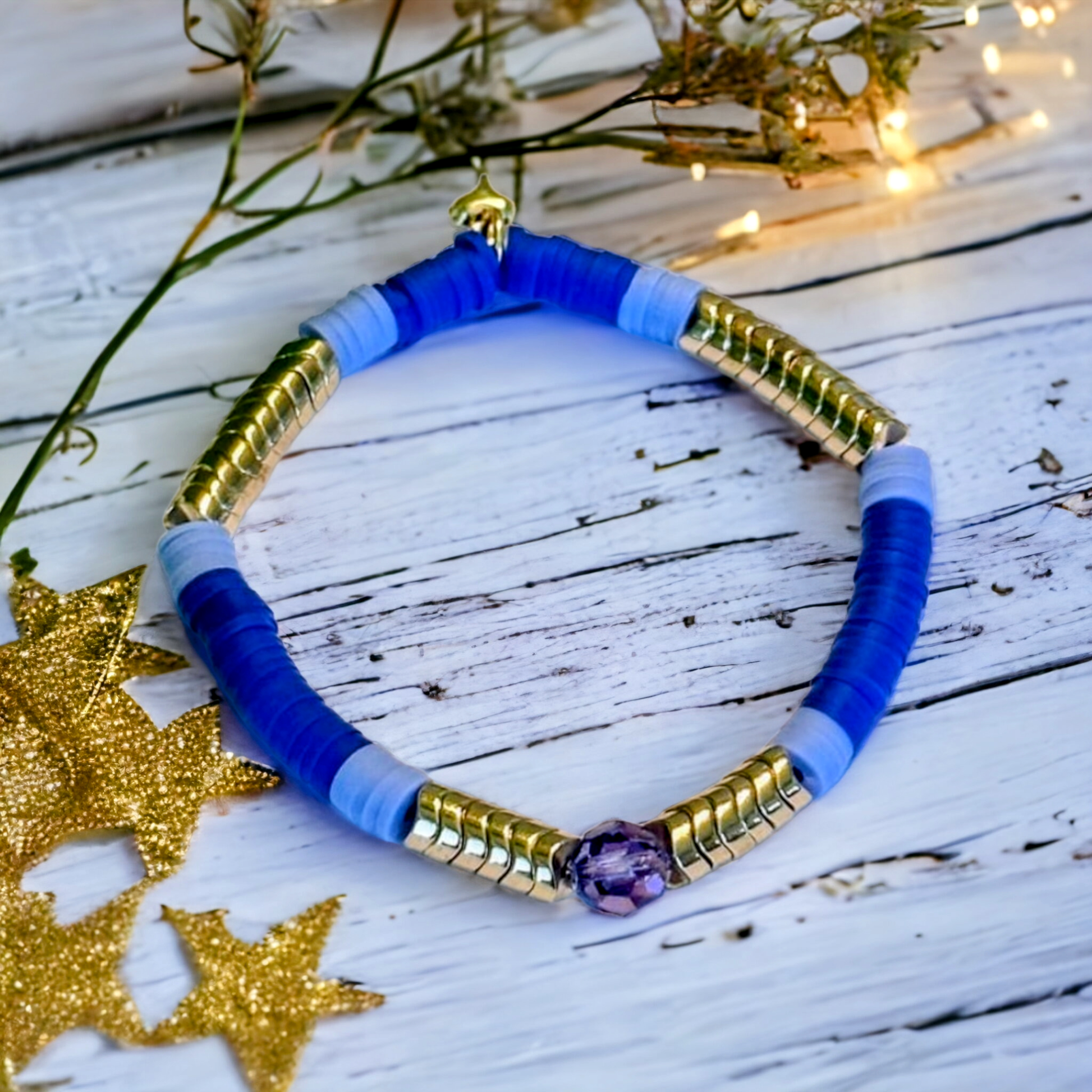 Voici le bracelet "Delphinium", composé de pierre d'hématite et perles heishi en argile polymère 6 mm. Il est décoré d'une perle Swarovski et une breloque en forme de coeur, en acier inoxydable.
