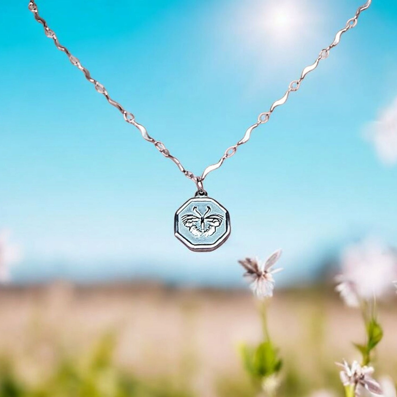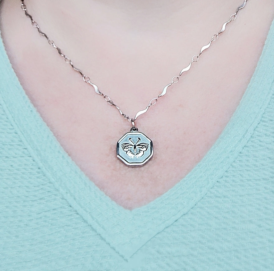 Voici le splendide collier "Transformation", composé d'une chaîne de 18 pouces et d'un magnifique pendentif d'un papillon 18 x 15 mm, en acier inoxydable hypoallergénique.