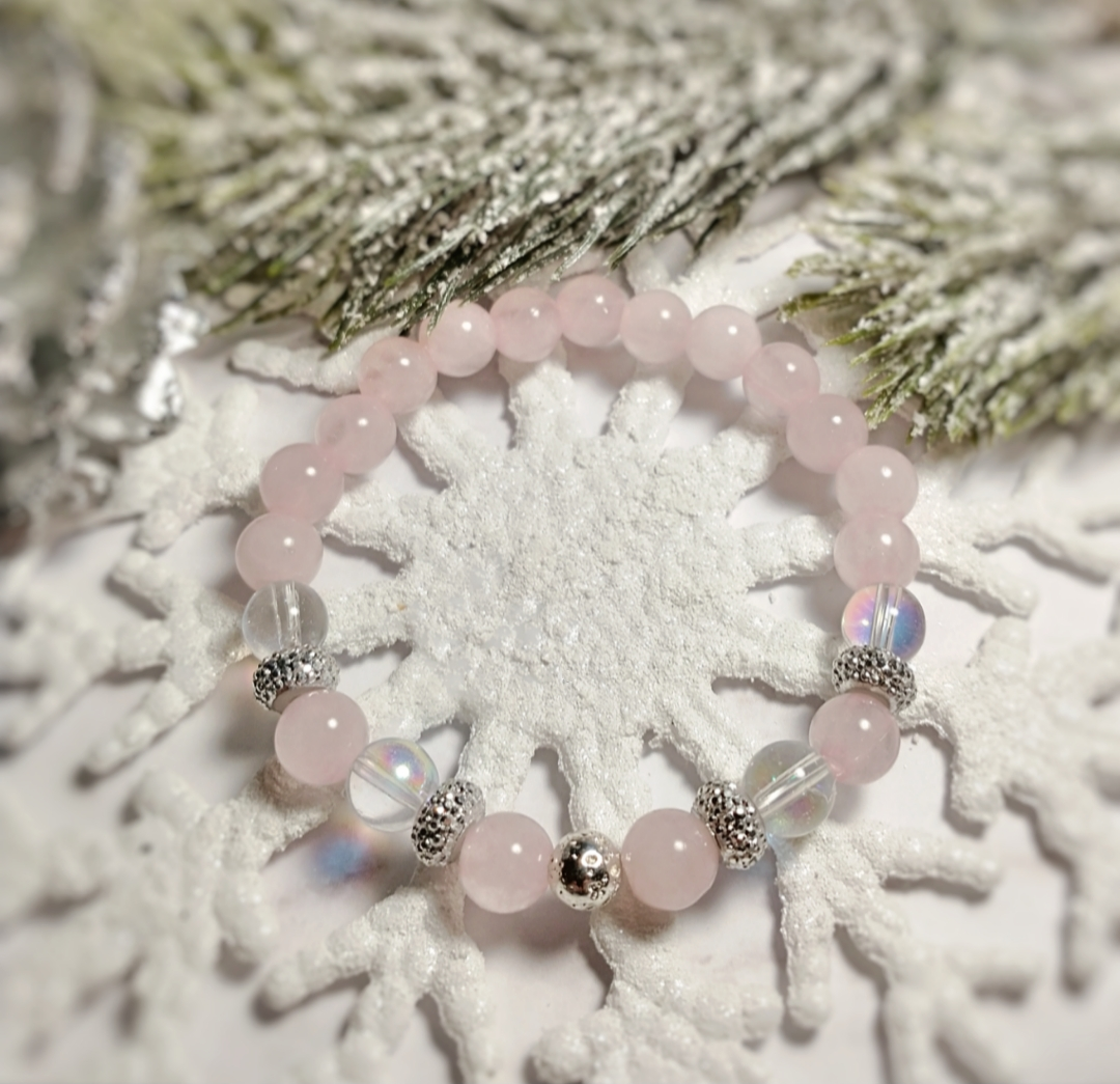 Voici le bracelet "Féérie", composé de pierre de quartz rose 8 mm, de billes en pierre volcanique argent galvanisé et décoré de jolies rondelles en résine argentée 4X8 mm et de billes en verre de cristal aux reflets arc-en-ciel 8 mm.