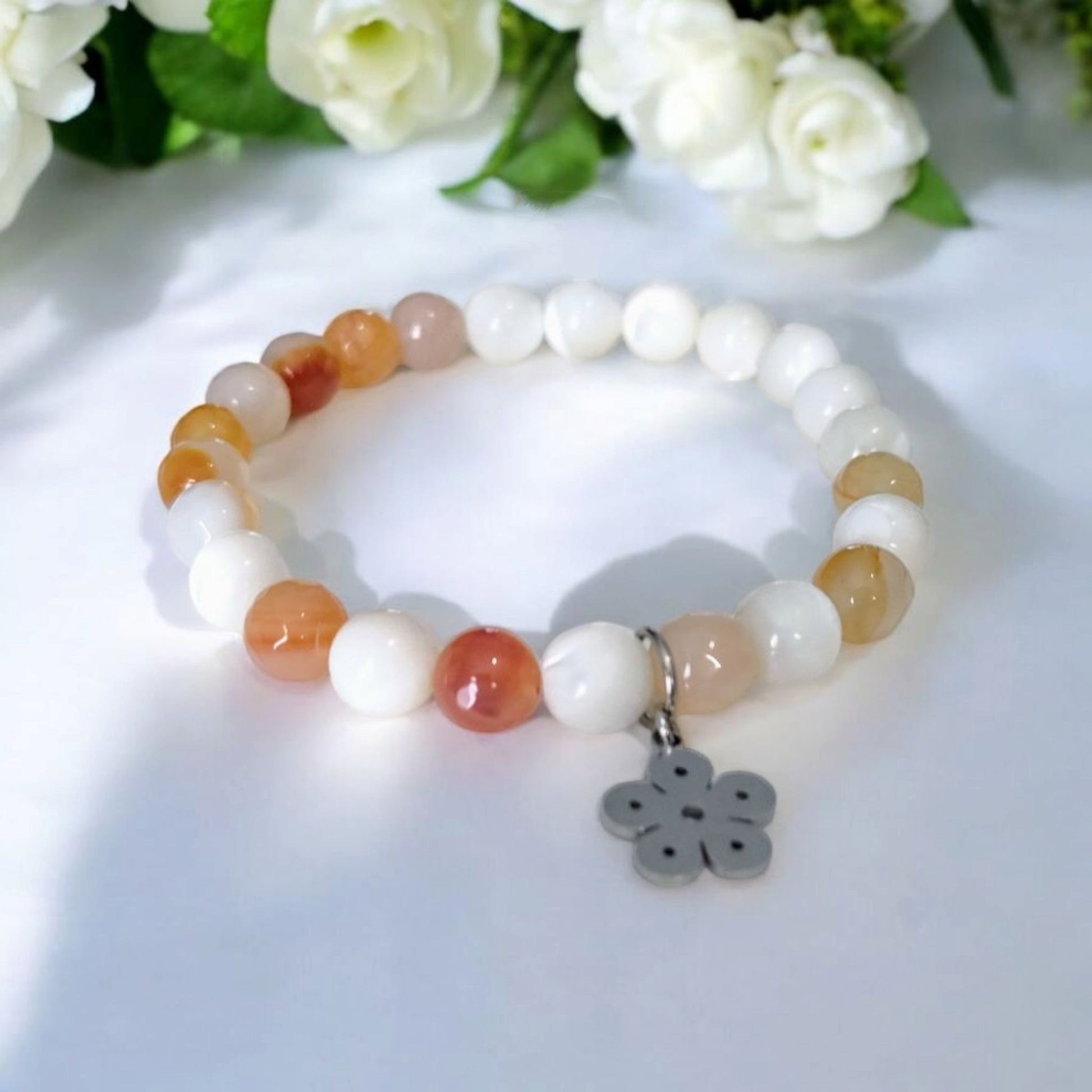 Découvrez le bracelet "Fleur d’Été", une création lumineuse composée de pierres d’agate orange à facettes et de perles de nacre de 8 mm. Il est délicatement orné d’une breloque en forme de fleur en acier inoxydable.