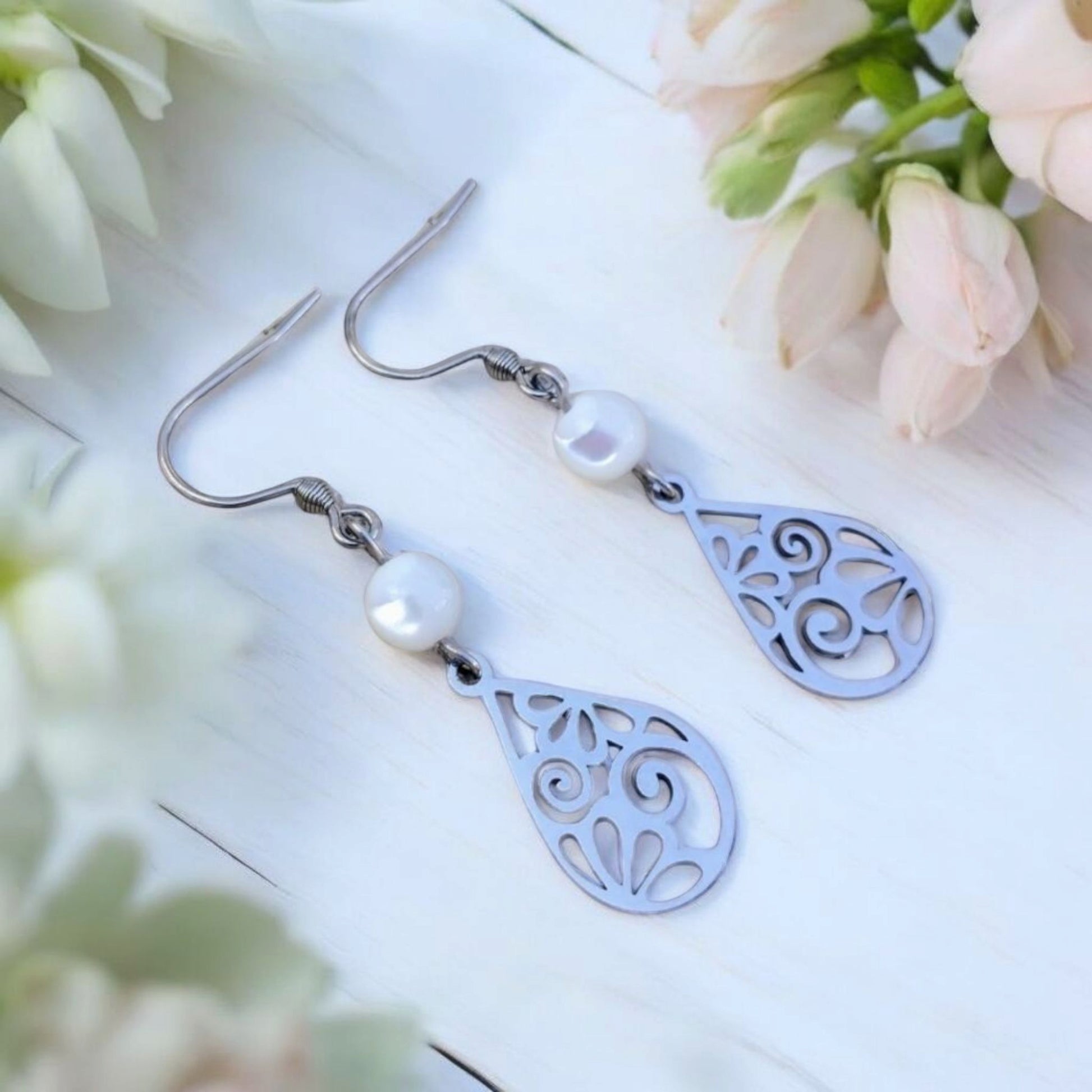 Voici les jolies boucles d'oreilles "Florentina", faites avec des crochets en acier inoxydable hypoallergénique, une perle de nacre 6 mm et une jolie breloque en forme de goutte à motifs floraux 13 x 22 mm, en acier inoxydable.