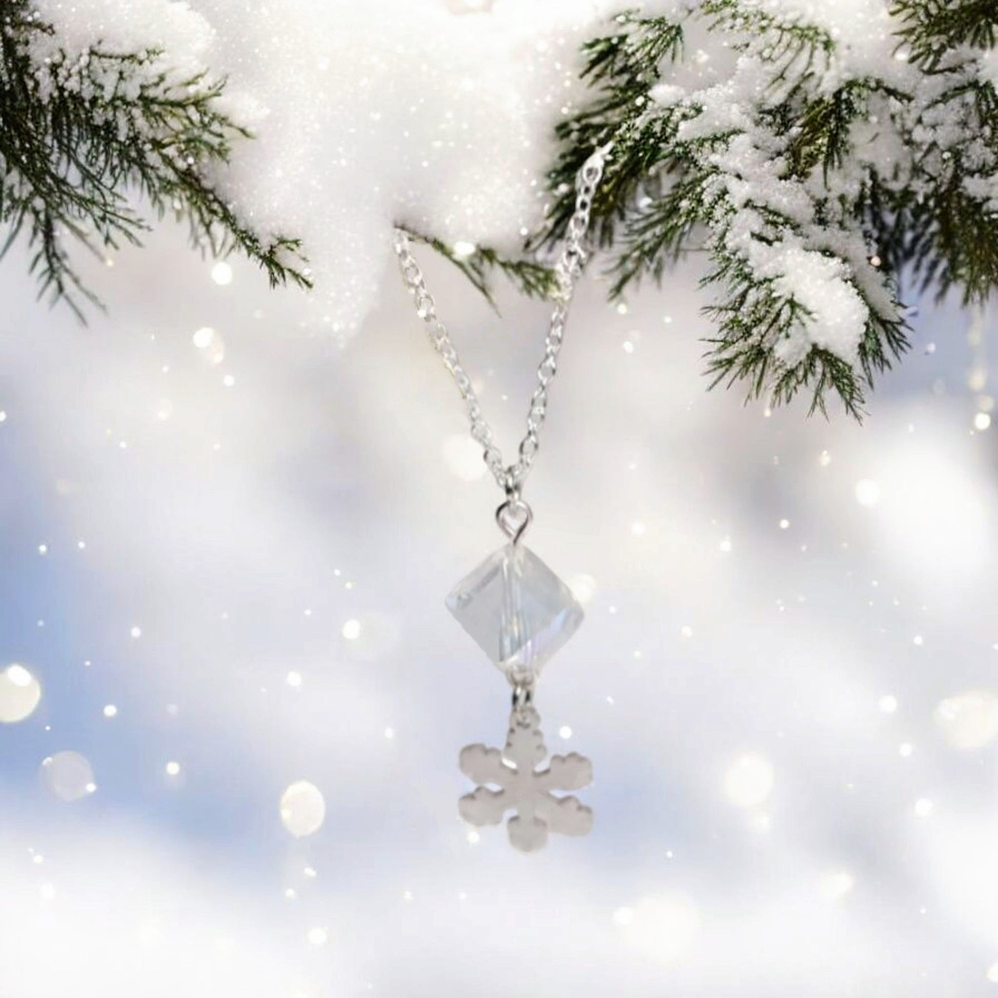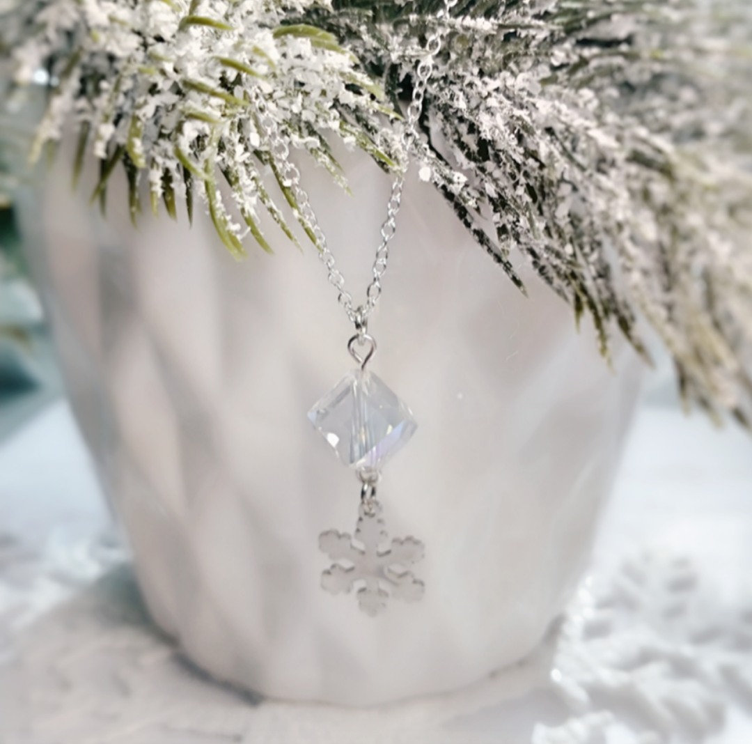 Voici la délicate chaîne "Frozen", en acier inoxydable hypoallergénique, ornée d'une breloque en forme de flocon de neige en acier inoxydable. Un magnifique pendentif en forme de cube en verre de 10 mm, transparent aux reflets arc-en-ciel 🌈 décore le tout.