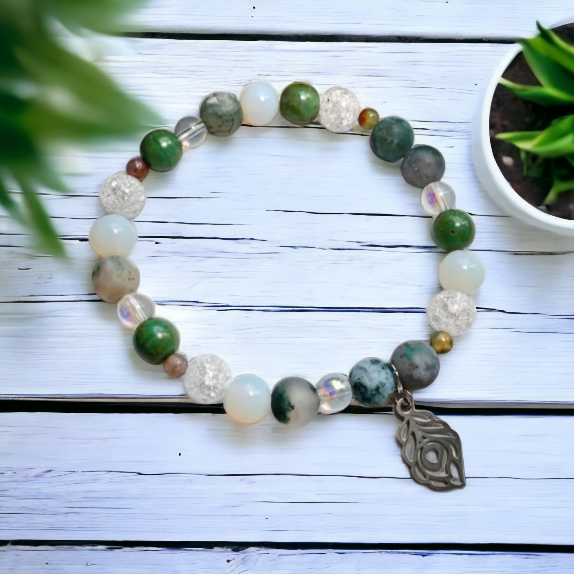 Découvrez le superbe bracelet "Équilibre", une création tout en douceur et en harmonie. Il est composé de pierres de jaspe fantaisie de 4 mm, de jaspe fantaisie mat, d’opaline, de billes de verre de cristal de 6 mm, ainsi que de quartz craquelé et de verre tchèque turquoise de 8 mm. L’ensemble est sublimé par une délicate breloque en forme de plume en acier inoxydable, symbole de légèreté et d’équilibre.