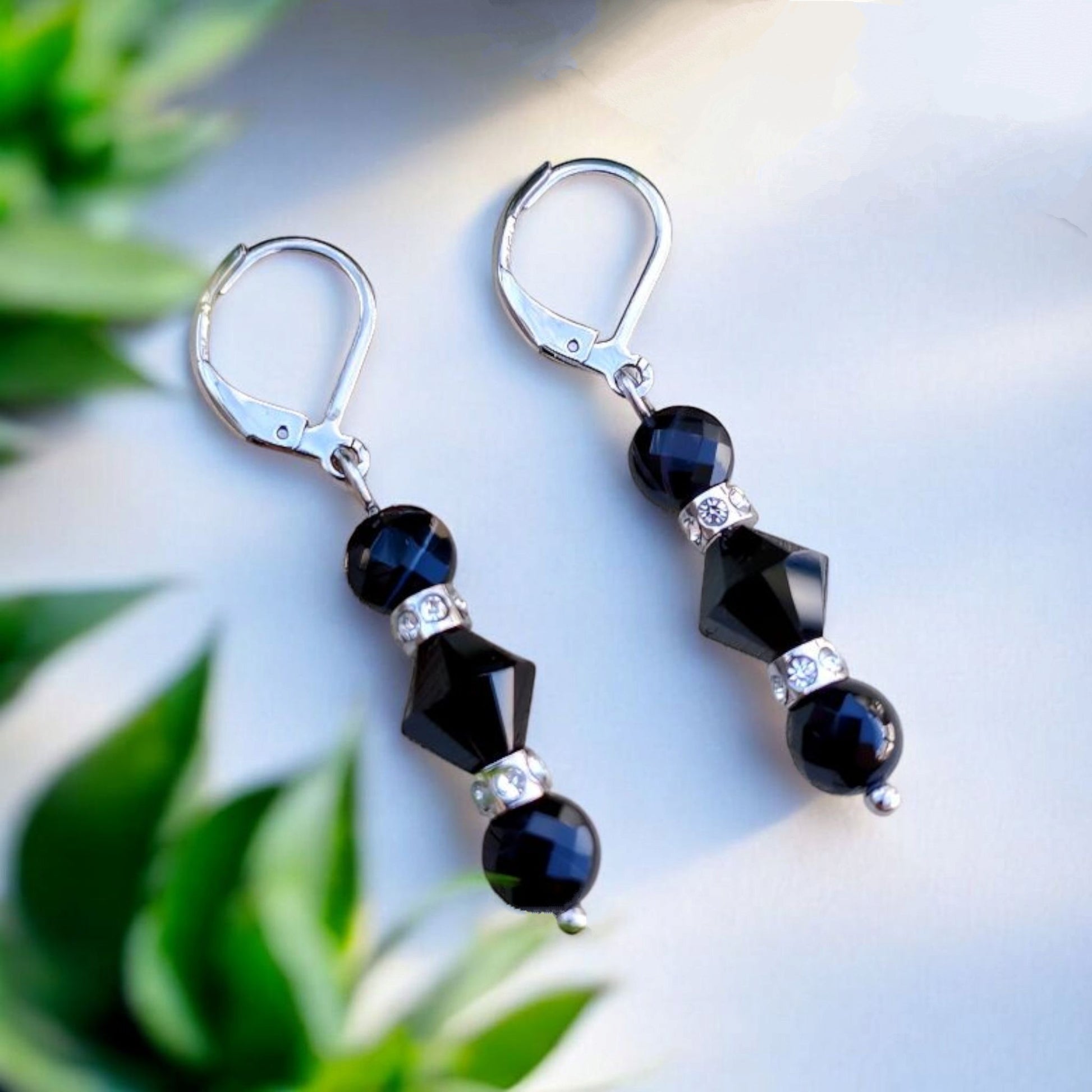 Voici les boucles d'oreilles "Haylie", faites avec des crochets en acier inoxydable, pierre d'agate toxédo, cristal Swarovski 6 & 8 mm et perles de strass en acier inoxydable.