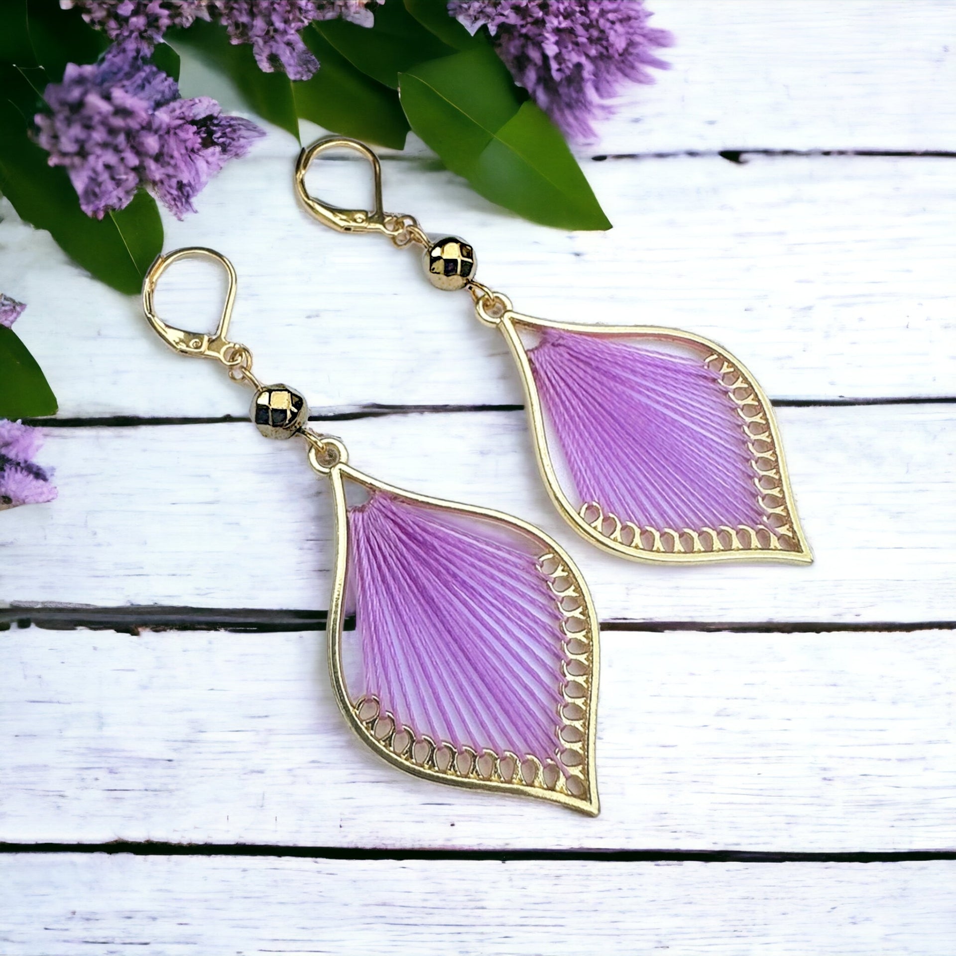 Voici les belles boucles d'oreilles "Joy", composées de crochets à charnière, en acier inoxydable hypoallergénique or et d'une pierre d'hematite à facettes dorées. Elles sont décorées d'un pendentif 42 x 26 mm, tissé en forme de gouttelette.