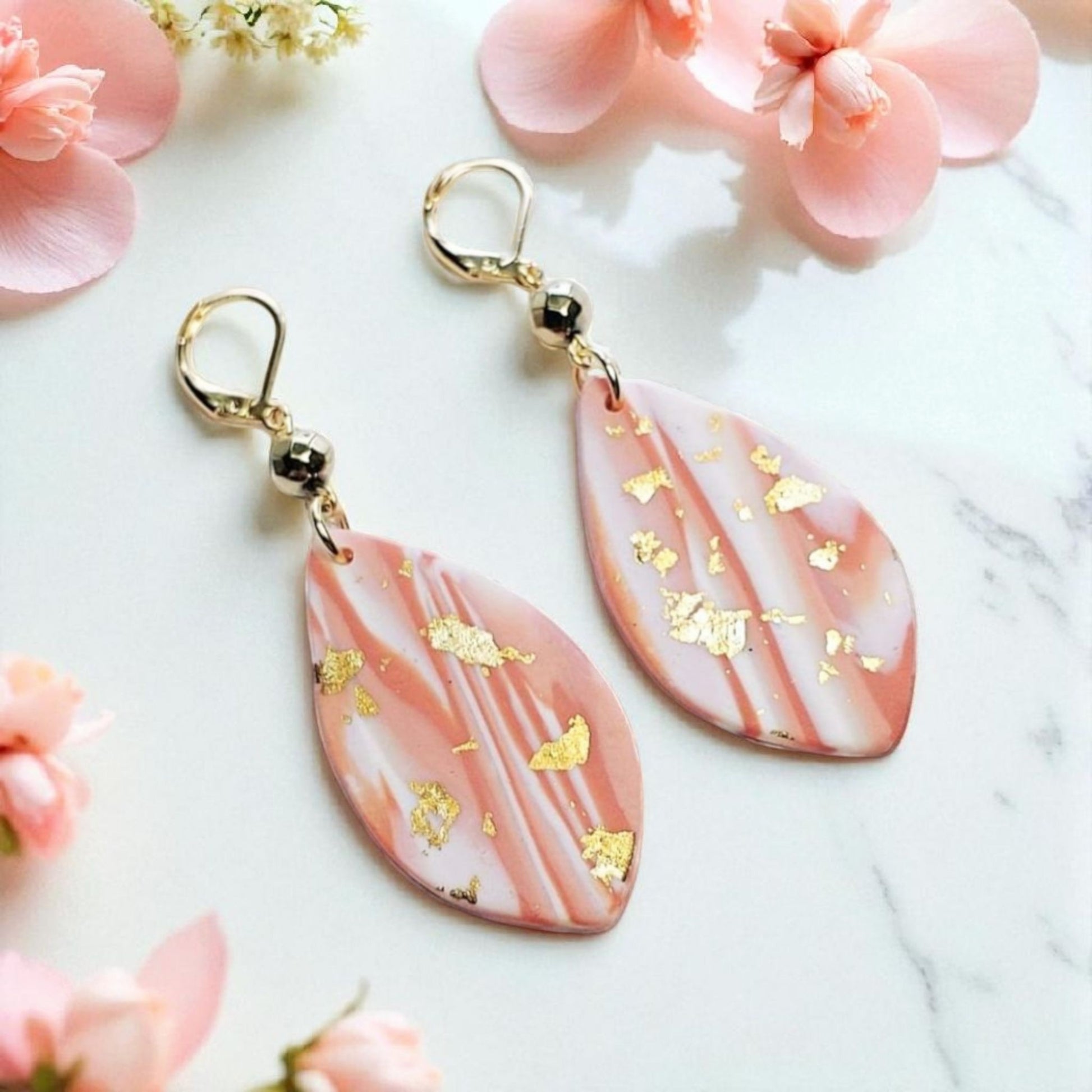 Élégantes et féminines, les boucles d’oreilles "Madelyn" se distinguent par leurs pendentifs en argile polymère aux tons rose, blanc et doré. Elles sont ornées d’une pierre d’hématite de 6 mm et montées sur des crochets créoles en acier inoxydable hypoallergénique.