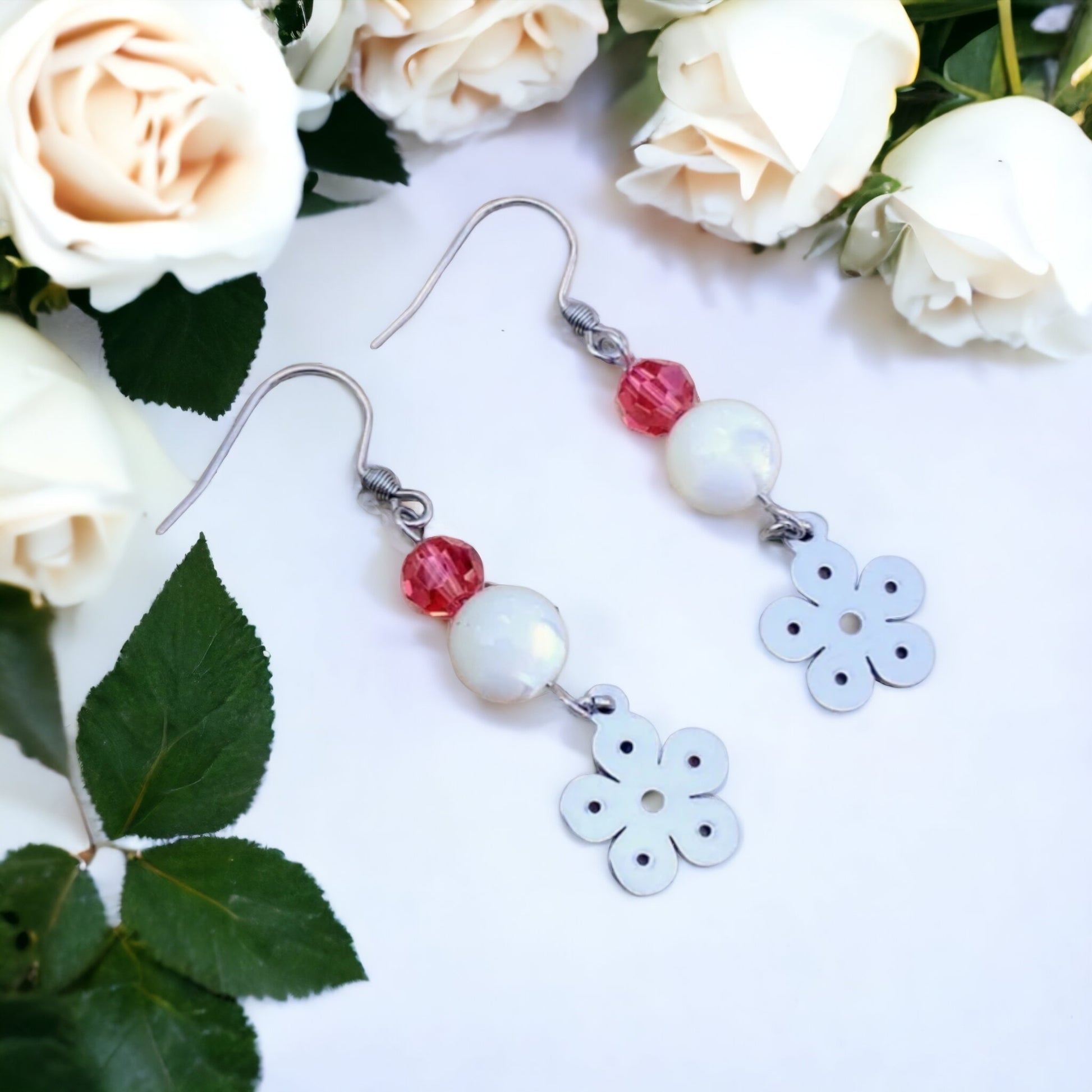 Voici les jolies boucles d'oreilles "Summer breeze", faites avec des crochets en acier inoxydable hypoallergénique, perle de nacre 8 mm et billes de cristal Swarovski . Elles sont décorées d'une jolie breloque en forme de fleur, en acier inoxydable.