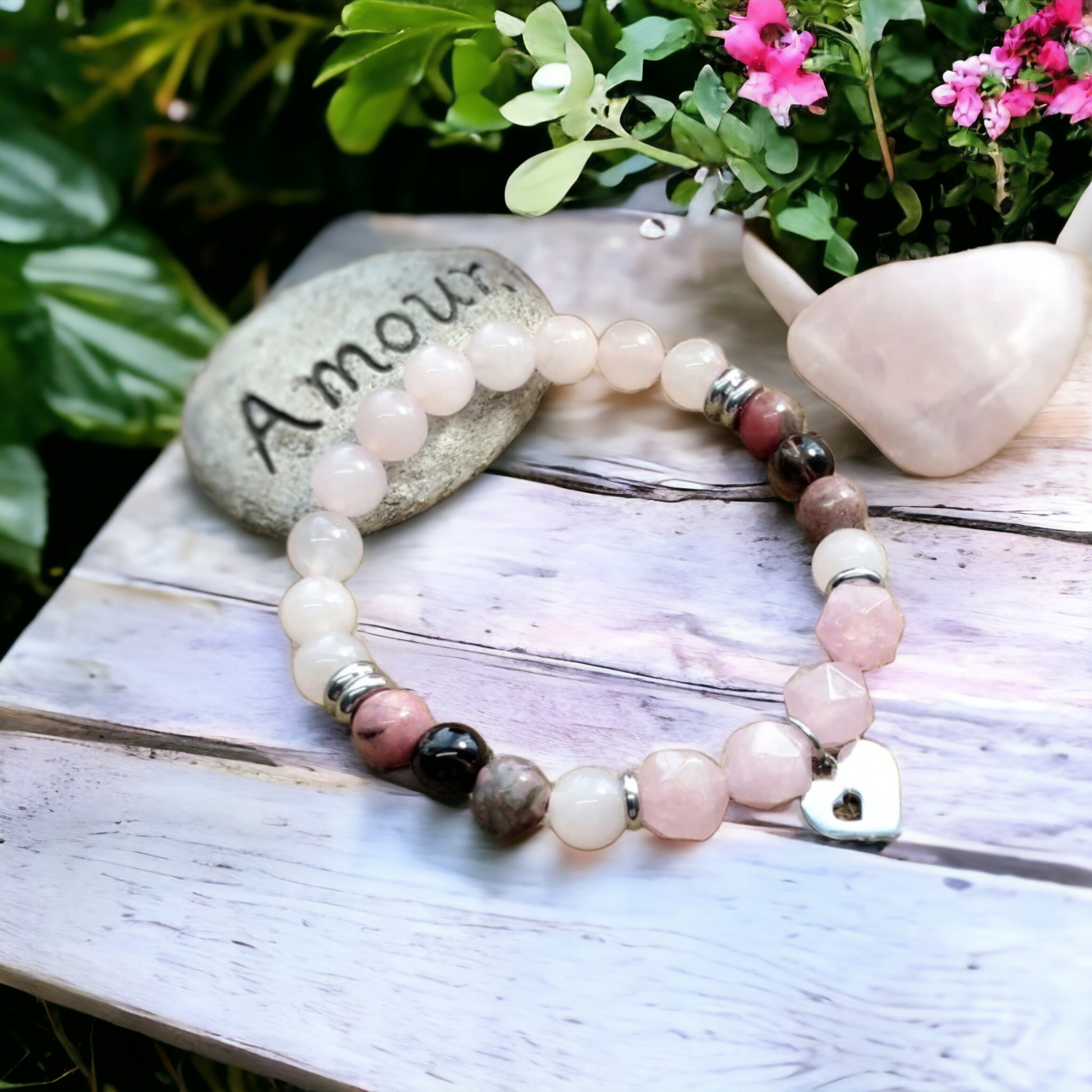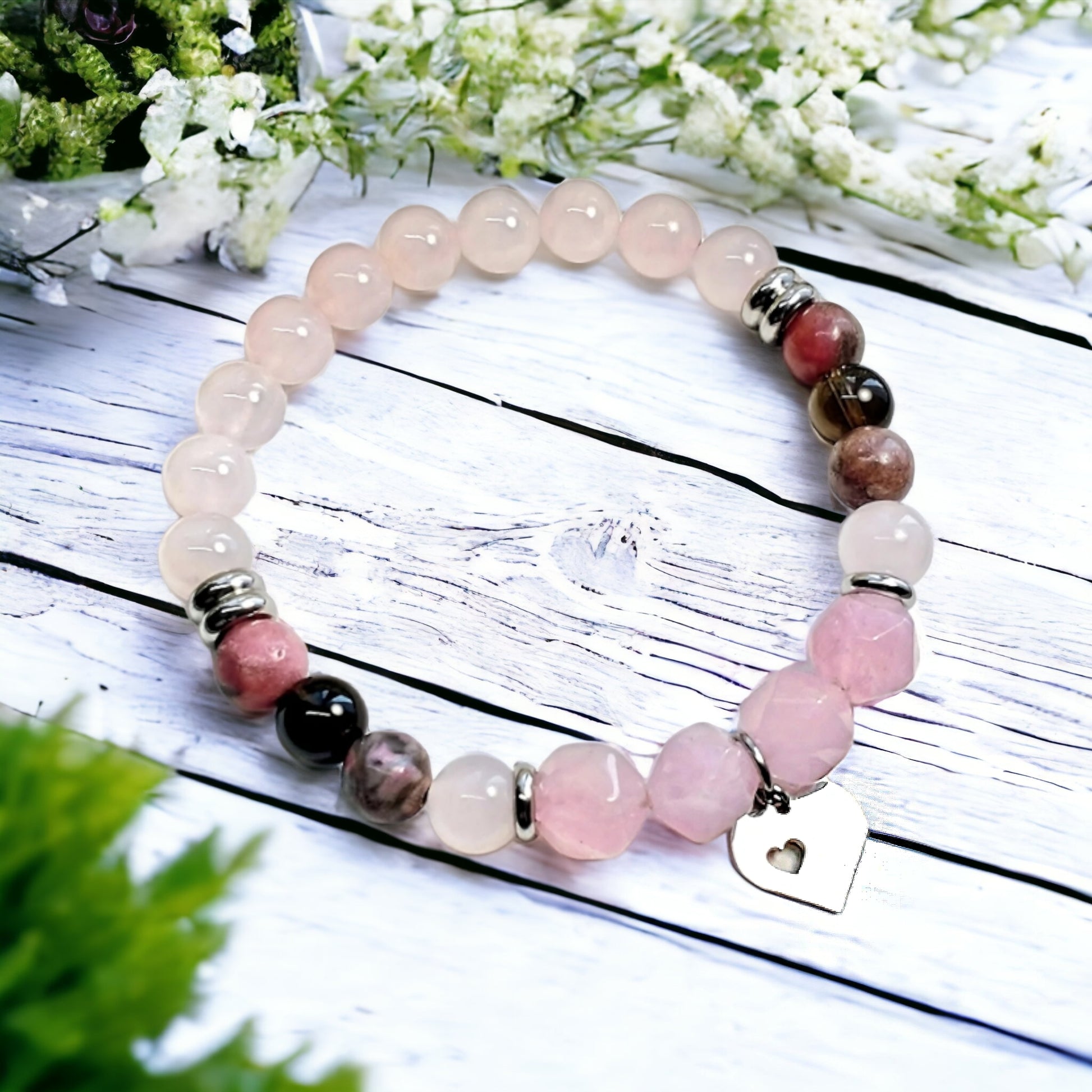Découvrez le superbe bracelet "Mandy", composé de pierres de quartz fumé, quartz rose et rhodonite de 8 mm, ainsi que de quartz rose facetté de 10 mm. Il est sublimé par une élégante breloque en forme de cœur en acier inoxydable, symbole de douceur et de féminité.